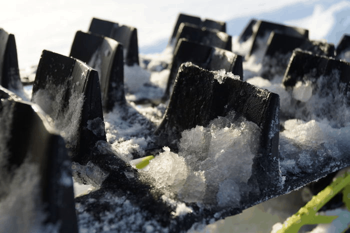 Nu kan det faktiskt vara så att Polaris Serie 6 och 7 matta är extra känsliga för varmgång, så det är något att tänka på att inte gasa allt för långa sträckor på hårdspår utan att mattan får en chans att kyla. Isrivarna hjälper ju till en hel del, men att gå från ett par där man kan backa utan att tänka på det till ett par som måste fällas upp vid backning är ingen lek. De höll i alla fall nästan 40 mil innan de gick av på ena sidan, vet att jag är långt i från ensam på den fronten.