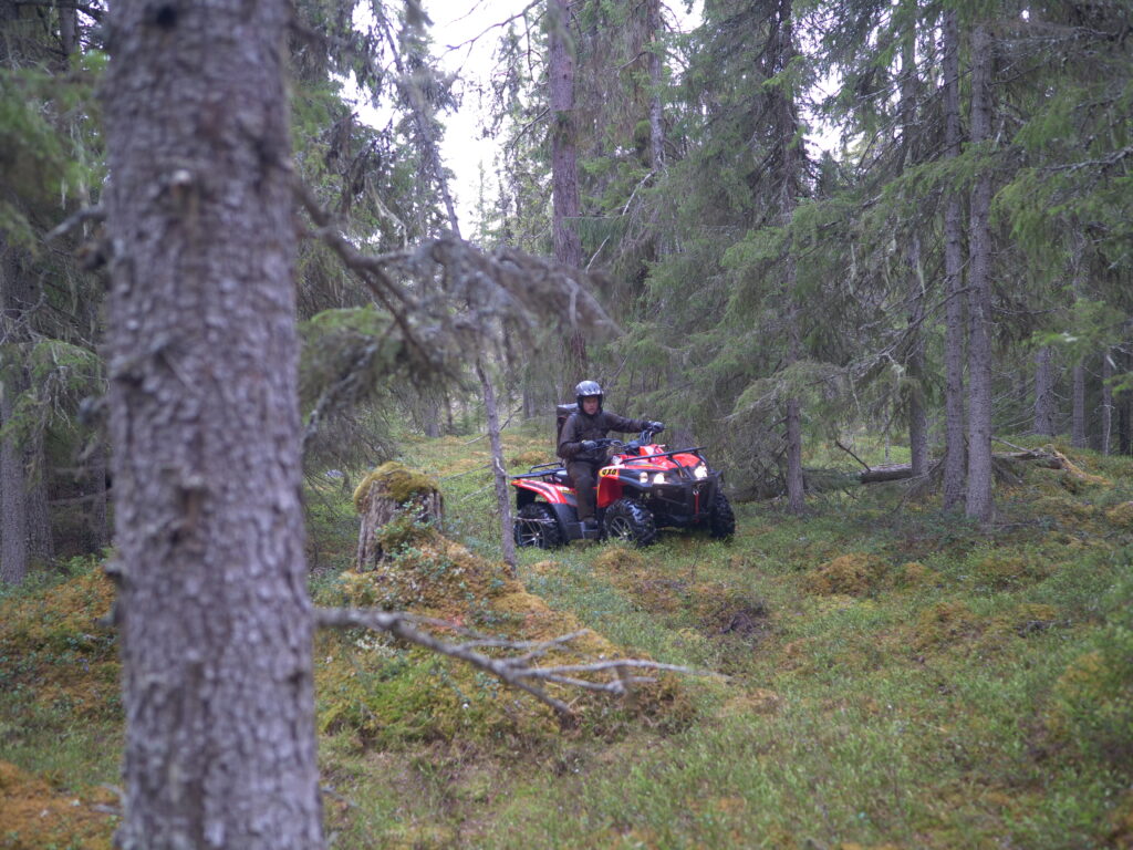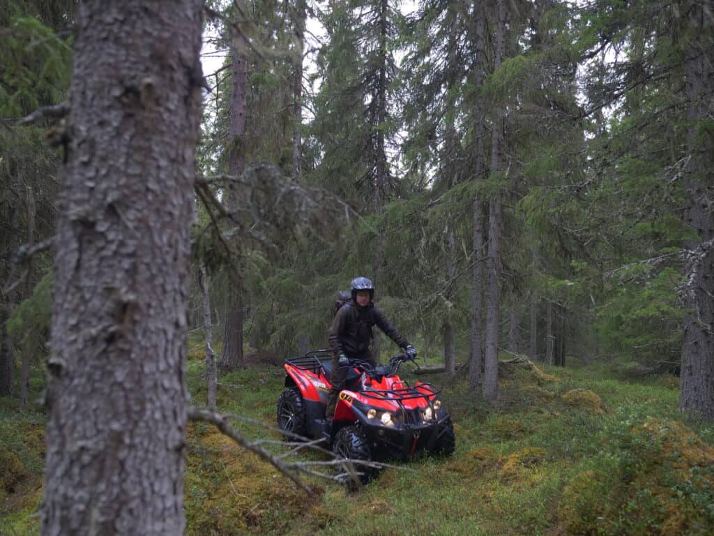 Med bra självförtroende växer hornen och tillsammans tar vi den första linjen ut i de vilda. Granskogen är tät och marken kuperad. Motorn på nätta 359cc får här jobba ganska hårt. Maskinen känns aningen högt växlad, och med stora maxxis bighorn däck blir det svårt att smyga, för att ta sig fram genom snårig skog och ojämn terräng får vikingen pressas till max. Problemet löser sig dock snabbt när undertecknad ändrar till lågväxel och uppträdandet blir nu helt annorlunda i framkomlighet. Servostyrningen känns aningen svag, däremot är det något jag uppskattar då det ger föraren mer känsla i styrningen. Fjädringen finns inget att anmärka på men då har vi inte heller någon last eller någon vagn kopplat på maskinen.