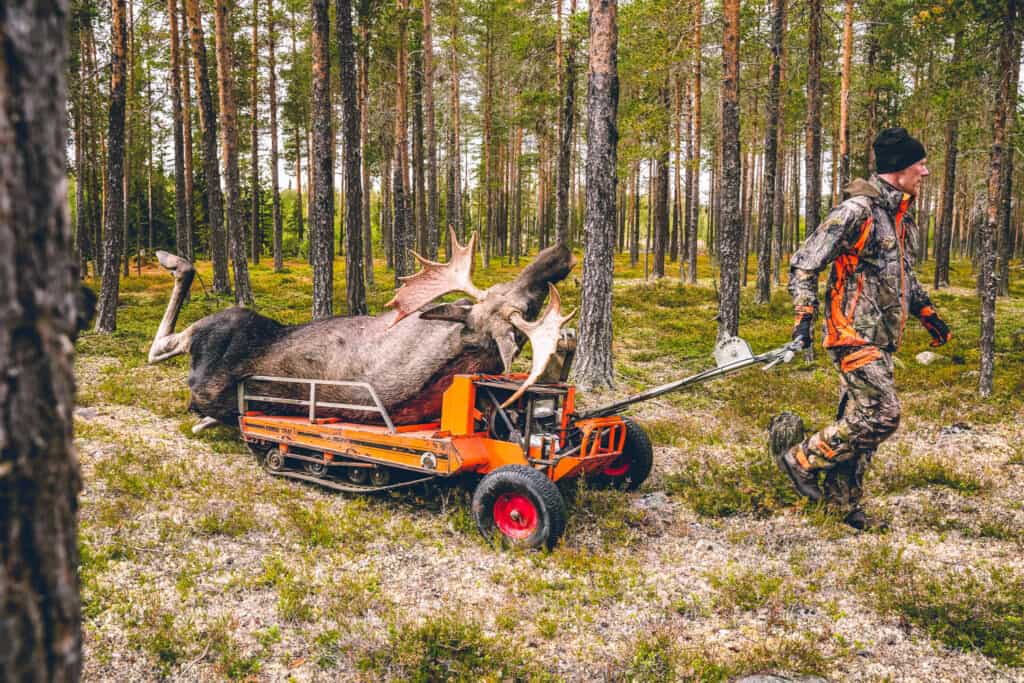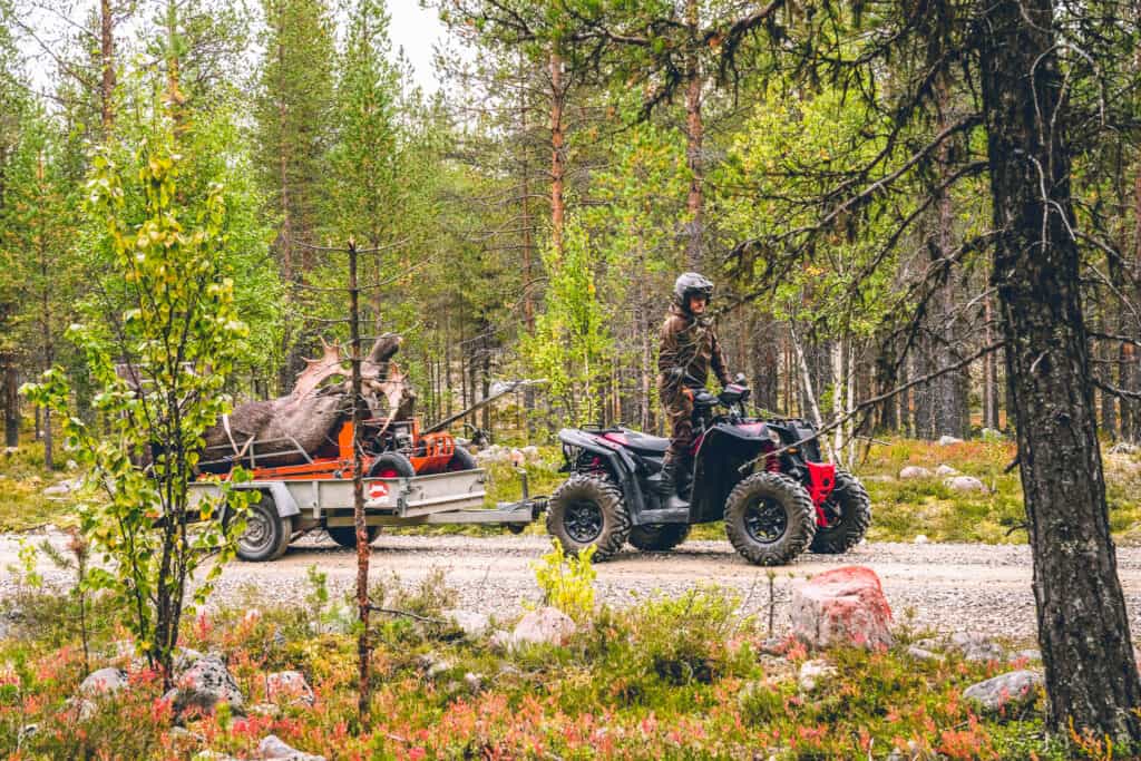 Krister Kraft med sin 14-taggareKrister Kraft med älgen påväg ur skogenPolaris Scrambler 1000 gör jobbet enkelt