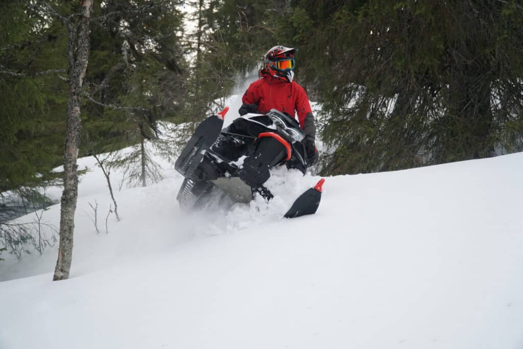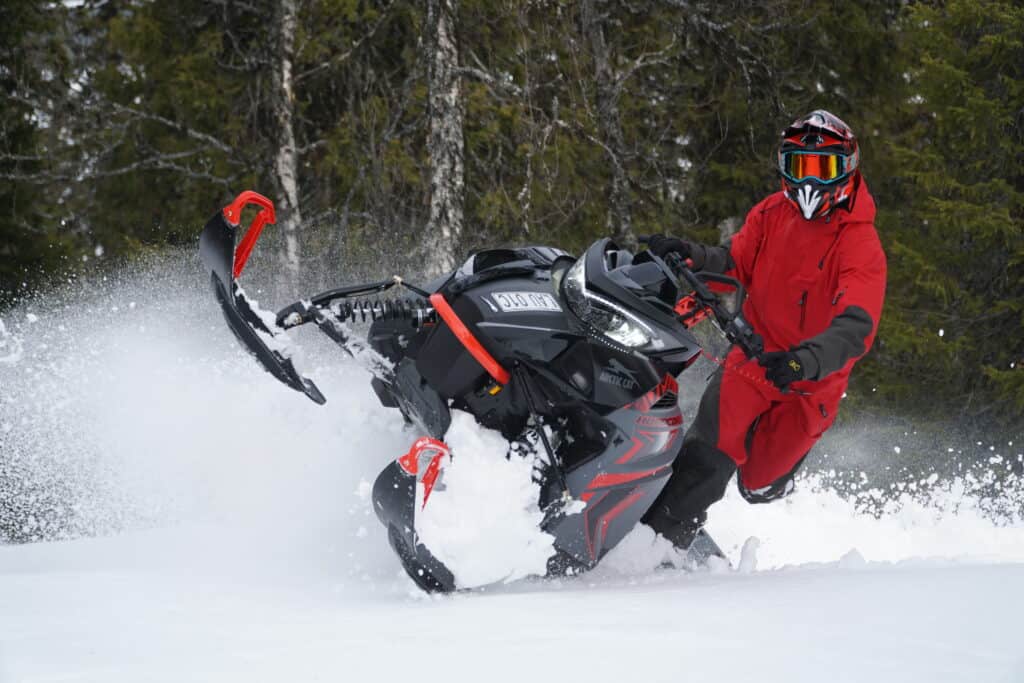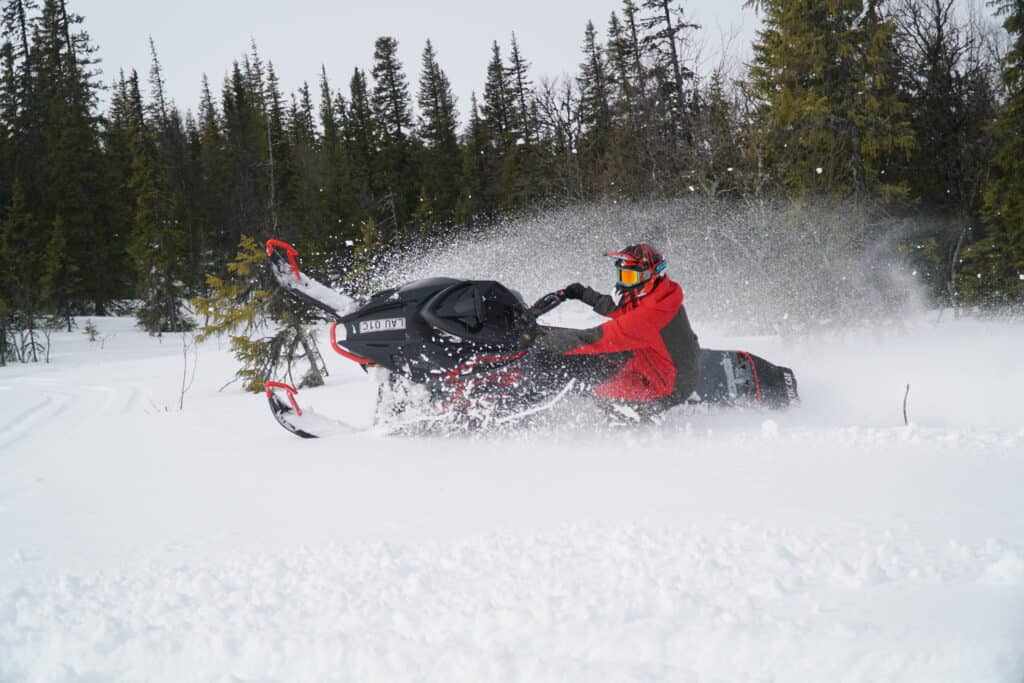 Det första vi reagerar på är vilken skillnad det är på mattan. Hardcoren har alltid varit en busig maskin men med nya mattan höjer den rolighetsfaktorn ytterligare ett snäpp, greppet är outstanding och den gör att maskinen gärna hissar skidorna mot skyn. Det nya greppet gör även att gasresponsen upplevs som betydligt bättre på alla varvtal. Effekten i den nya drivlinan tillsammans med greppet finns att hämta precis när du ber om det, något som uppskattas i hög grad vid teknisk körning.