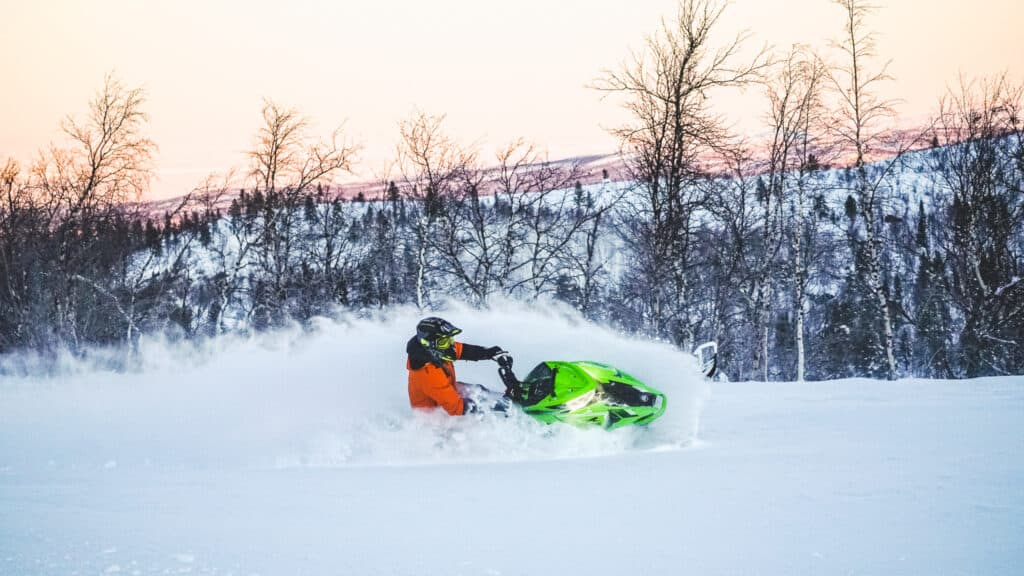 När vi äntligen tagit ta lite höjd efter fjällsidan var det som att komma till en annan värld, tempen steg markant och likaså snödjupet. Nu kunde man äntligen börja känna på hur maskinen beter i djupare snö, tidigare mil har körts kring Boden och snödjupet har inte varit det bästa men ändå fullgott för att få bort det råaste ur maskinen. Jag tar sikte mot en myr som jag ser genom fjällbjörkarna, när jag kommer ut där yr bara snön när jag lägger omkull Alphan. Den känns otroligt lättbruten och jag inser fort att jag nästan överarbeta den, efter en tight vänstersväng trycker jag gasen mot styret och rycker till. Jag kommer på mig själv med att göra glädjetjut då skidorna ställer sig rakt upp i luften, adrenalinet sprutar och jag känner mig som 20 år igen. Trotts att maskinen inte är fullt inkörd och saknar några hundra rpm går den fruktansvärt bra, motorn svara på minsta input och variatorn backshiftar rickigt fint vid omtag.