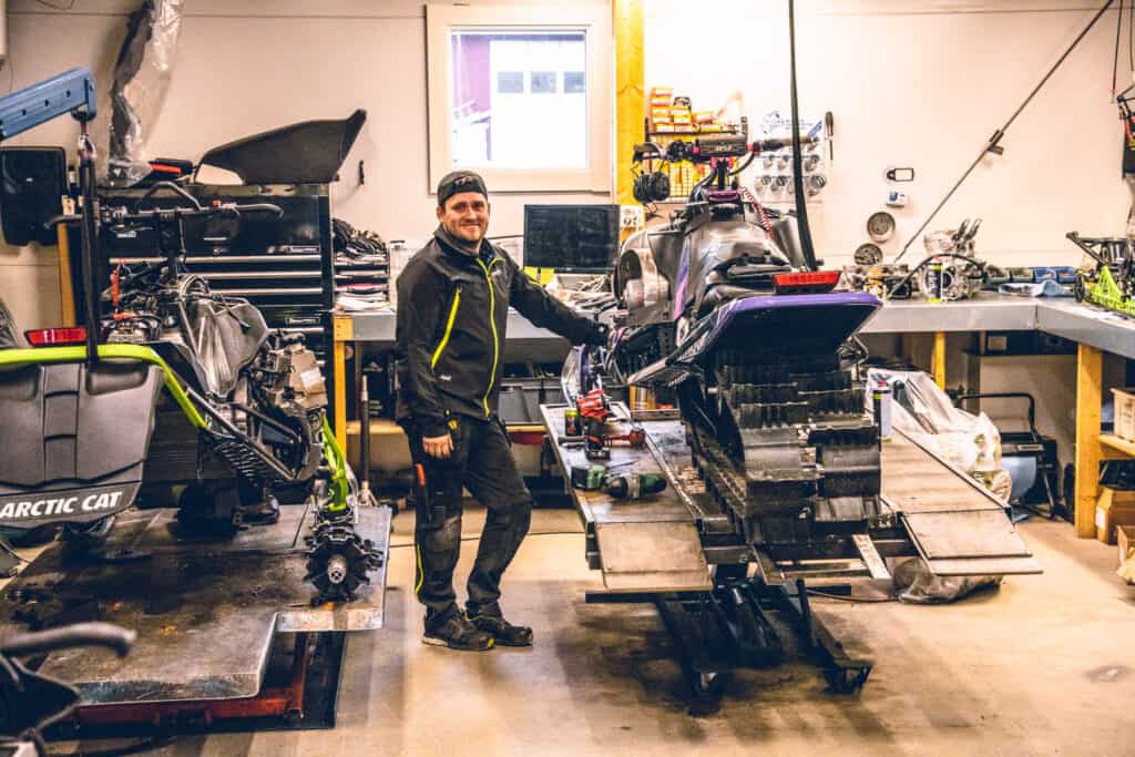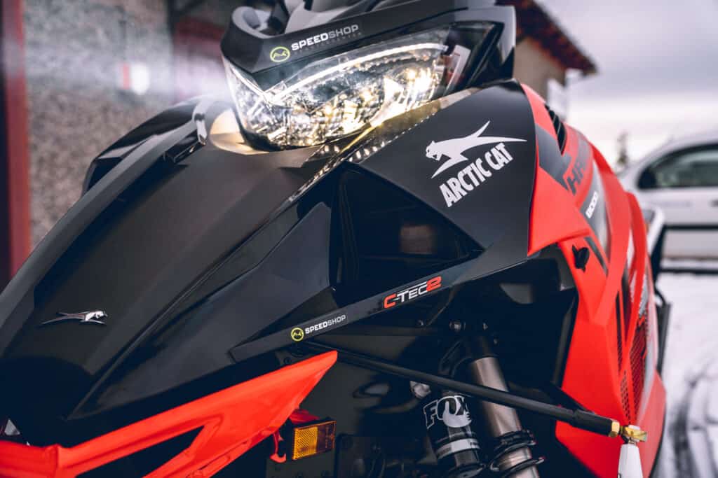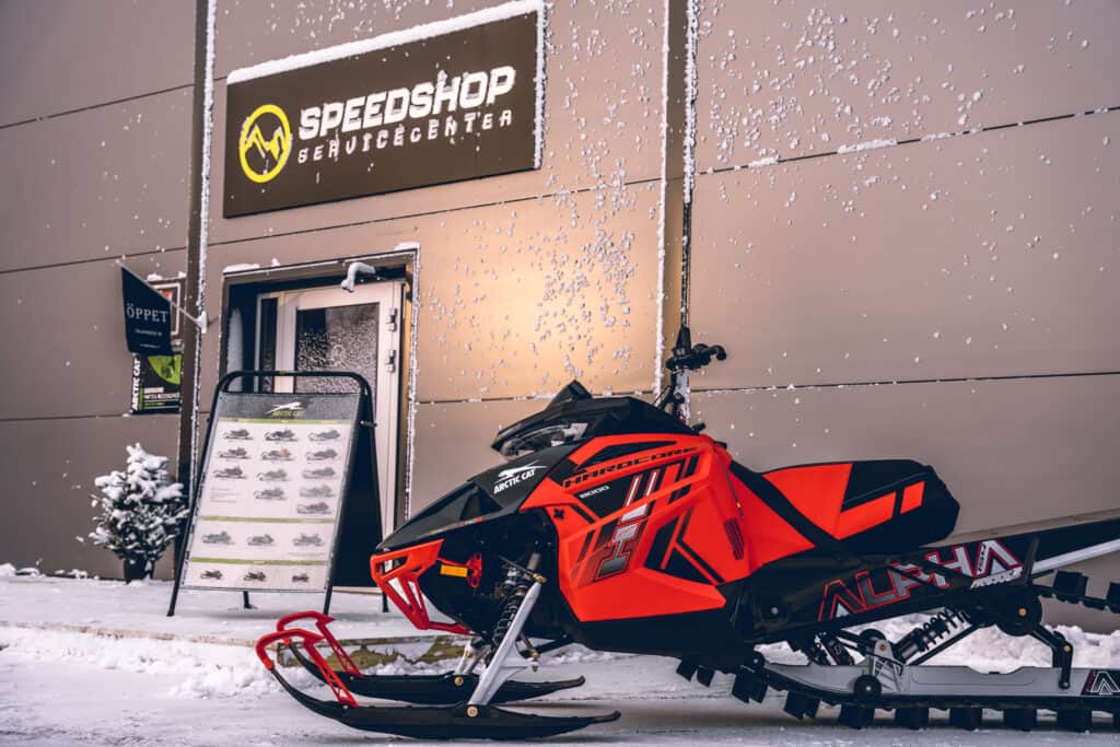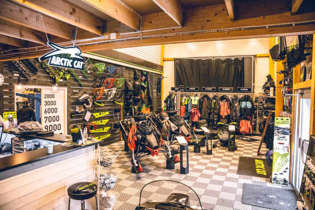 Väl i butiken möts jag av välfyllda hyllor med tillbehör och produkter från Arctic Cat, kläder från Jethwear och Rought concept bakbågar som Speedshop Servicecenter är ensamma om att ta in till Sverige. En riktigt snygg bakbåge som finns till alla snöskotermärken och som förstärker chassit i tunneln.