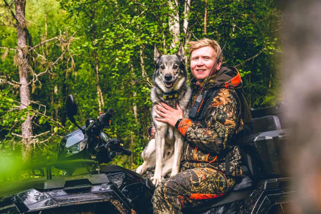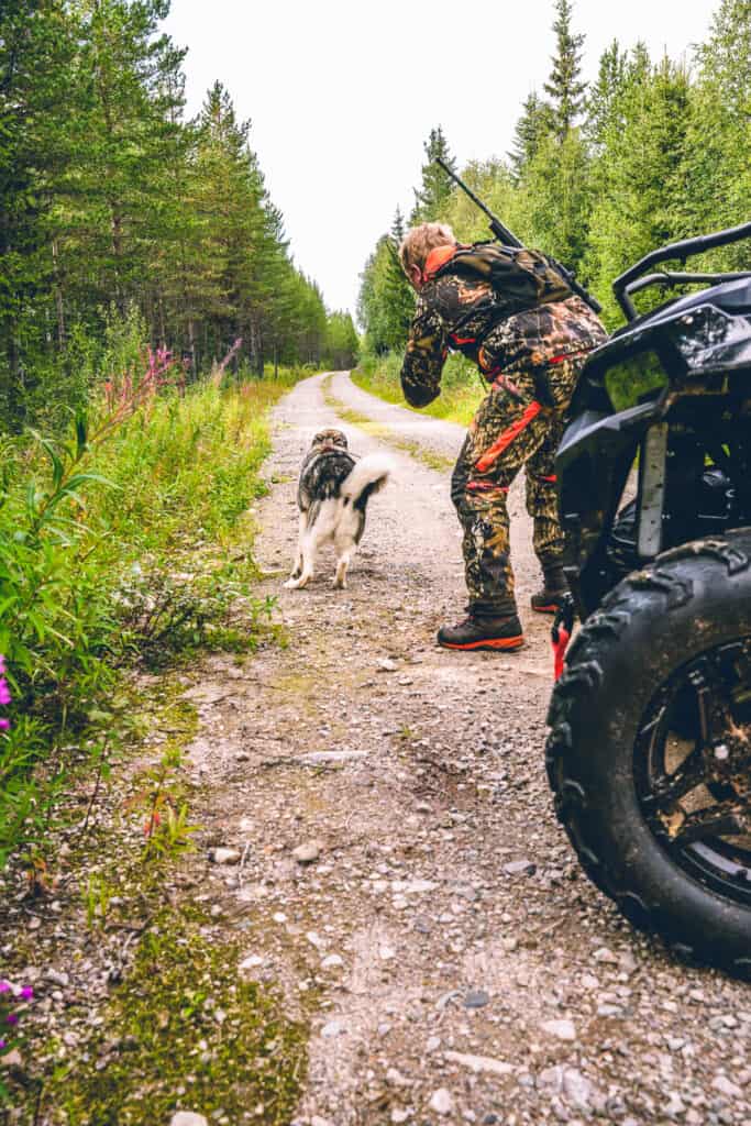 Efter någon timma spaning bekvämt färdandes på vår Polaris Sportsman 570 utan några färska björnspår eller björnskitar bestämmer vi oss för att åka hem till stugan lasta hunden och släppa på frisök längs en sida där björn spanats tidigare under sensommaren. Vår fyrbenta vän som vi sätter tilliten till är Jakthunden Tull som är en utomordentligt duktig älghund. Förutom älg har Tull även skällt på Björn tidigare och det är honom vi ger chansen denna morgon.