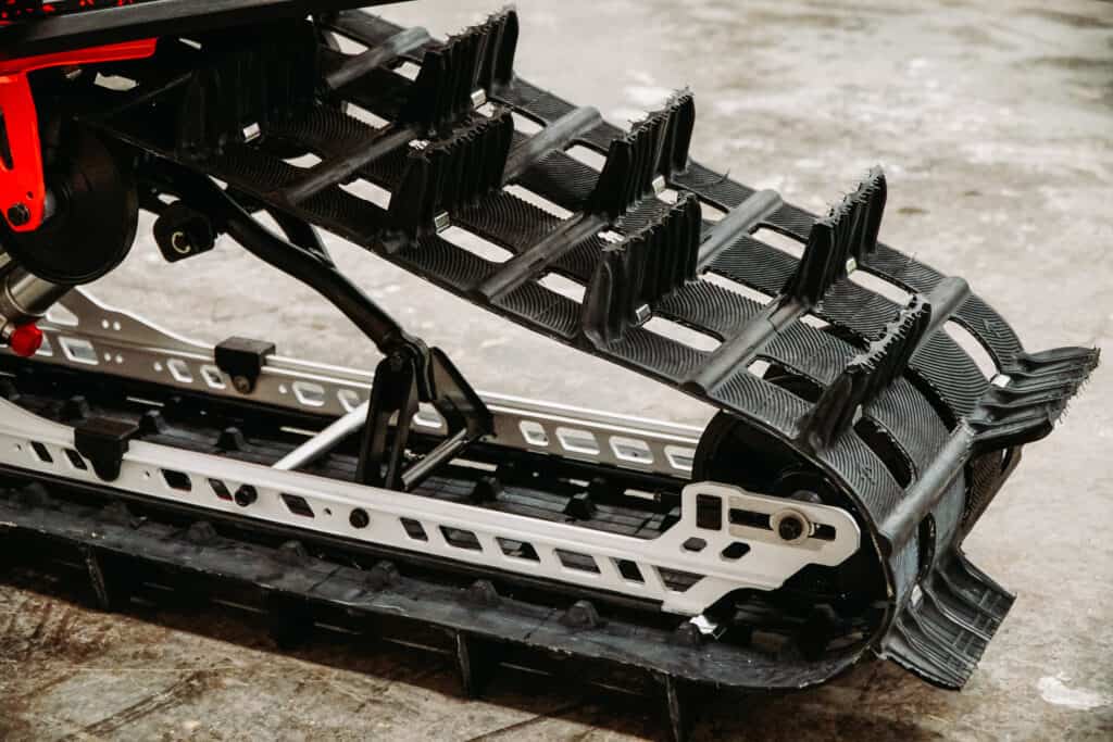 Det är svårt att förneka att skotern är busig och rolig med denna matta. Men för att försöka få skotern ännu vassare och förbättra helhetskänslan har vi kollat vad DUELL har i portföljen. Våra ögon fastnade på ett alternativ från Camso, Conquer 280. En matta som har ett helt annat mönster. Man kan förenklat säga att det är mer likt en klassisk ”Power claw”, där man har 1 kam per stav på mattan som sedan ligger ”omlott”. Däremot är utformningen på kammarna något helt eget. De 2,8” höga kammarna som täcker halva mattans bredd ser enorma på den övrigt nakna mattan. Varje kam ser likadan ut, är urskålade och har en styvheten i gummit känns lagomt hård. Vid en första anblick finner vi en risk i att detta kan komma att greppa mer än vad vi hade kunnat hoppas på!