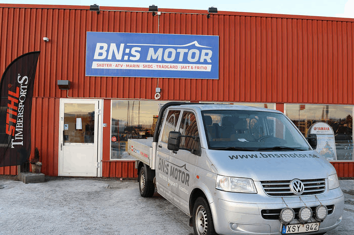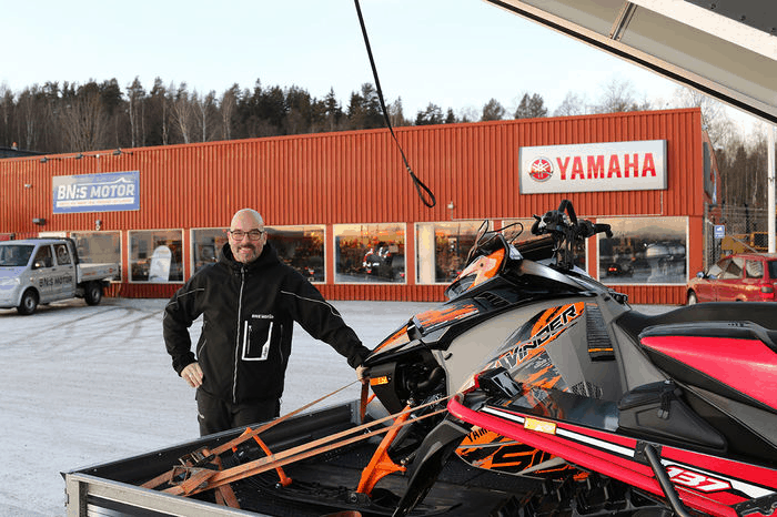 Lagom omskakad efter äventyren på det hala underlaget kör jag in utanför BN:s motor i Kramfors och går in för att hämta maskinerna. Ägaren Göran bjuder på en kopp kaffe och lite skotersnack innan det är dags att lasta upp båda maskinerna och återigen vända kosan norrut.