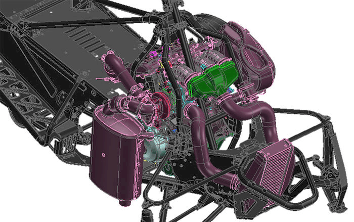 Men vi tar väl bort huvar och sidopaneler och kollar in vad det är som mullrar så gött inifrån pannrummet. Jo, där sitter den och ruvar, den helt nyutvecklade trecylindriga 998cc turbomatade Genesis 180. En effektstinn pärla om ni frågar oss. Det kanske ni inte gör, men vi säger det ändå…