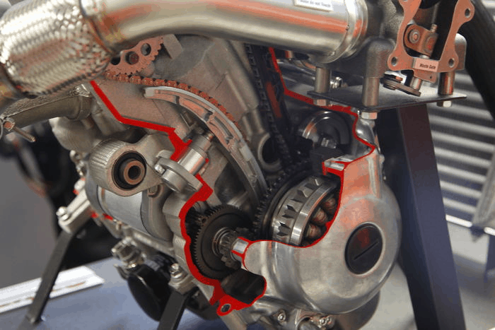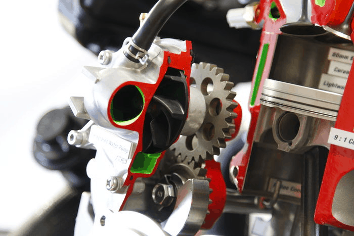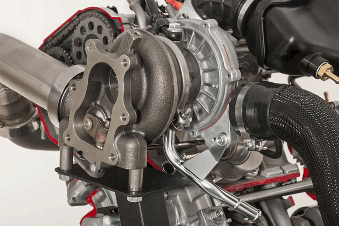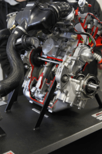 Kolvarna, som är gjutna i aluminium och har en delvis ny utformning jämfört med tidigare modeller, åker uppåt och komprimerar bränsleluftblandningen. Tändstiften ger fyr och… Bang! Kolvarna skickas ner, vänder uppåt, avgasventilerna öppnar och vips är första cykeln avklarad. Så fortsätter det i en hastighet på upp mot 8750 rpm. Kolvarna nykonstruerade som sagt, även vevstakarna, vevaxeln, vevhus och cylindrar är nykonstruerade för att klara de extra påfrestningar som turboöverladdning innebär. Motorn är också utrustad med en balansaxel för att minimera vibrationer och därmed öka prestanda och uthållighet hos både människa och maskin. Denna balansaxel tjänar även som drivaxel för vattenpumpen.
