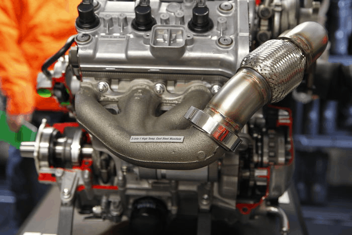 Ett annat vapen i kampen mot turbolagg är det helt nyutvecklade 3-1 grenröret. Detta är konstruerat speciellt för att ge avgaserna så kort väg det bara går till turbinen där de gör nytta. Kortare väg från motor till turbo = snabbare respons. Grenröret är även det gjutet i en speciell legering som klarar temperaturer på över 900 grader Celsius utan att expandera, eller för den delen, spricka när godset kyls ner till mer normala temperaturer.