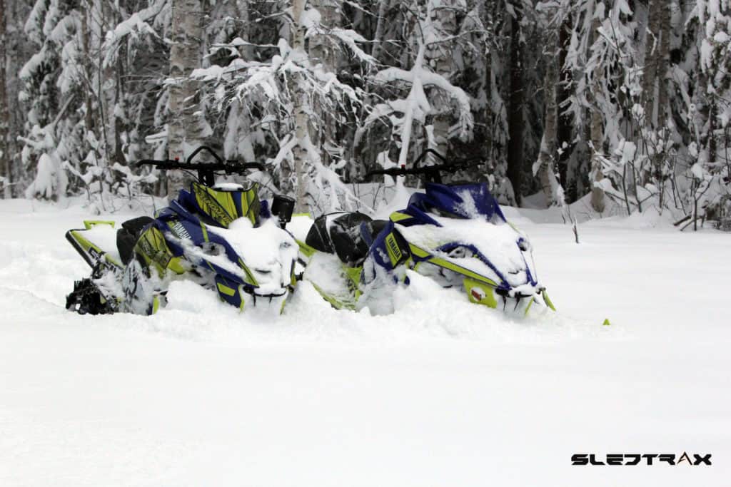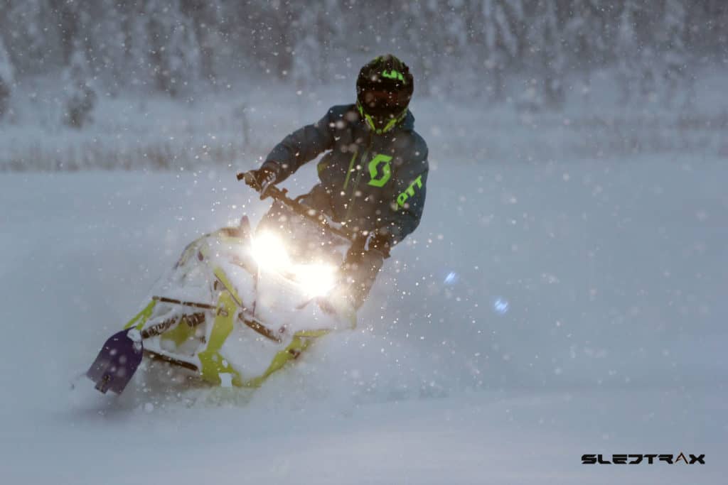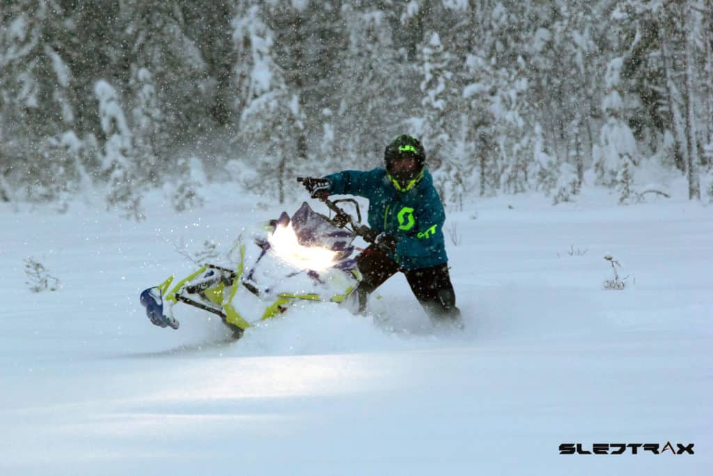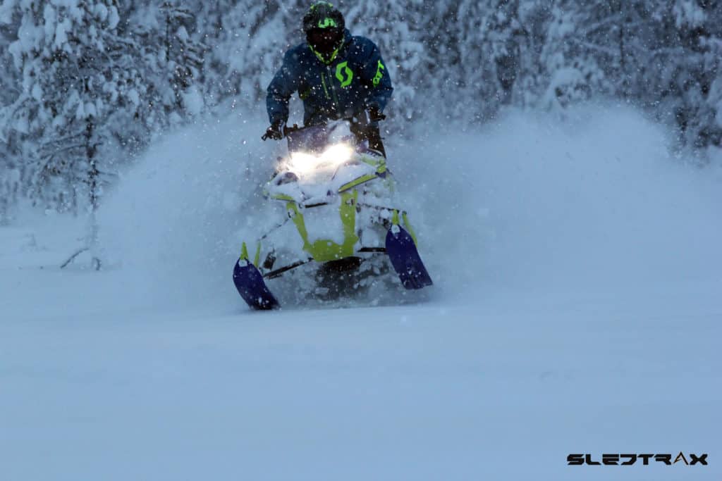 Första milen på min nya partner avverkas efter en slingrande väg där det ligger precis tillräckligt med snö för att göra första pudersvängarna. Lite ringrostig är man nog efter den bara delen av året men lyckoruset infinner sig direkt. Vid en paus ställer vi maskinerna bredvid varandra, Jesper har hunnit göra en del förändringar på sin maskin under hösten. En snorkel sticker upp genom huven och skvallrar om att effekten ställts upp, det sitter även en del Skinz produkter och ett dekalkitt på maskinen. Onekligen ser den arg ut då även lyset monterats bort och rutan flyttats ner.
