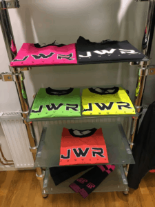 FÄRG, var det första som slog mig när jag blickade in i rummet. Nästa år blir det mycket färg i olika kombinationer. Det första ögonen sökte sig till var de nya Racetröjorna som låg fint vikta på en hylla. Renosa, gul, grön, svart och korall. Vindtäta med Jethwear logga på bröst, armar samt vid ryggens slut. Tomt fält upptill på ryggen för att kunna trycka namn samt startnummer.