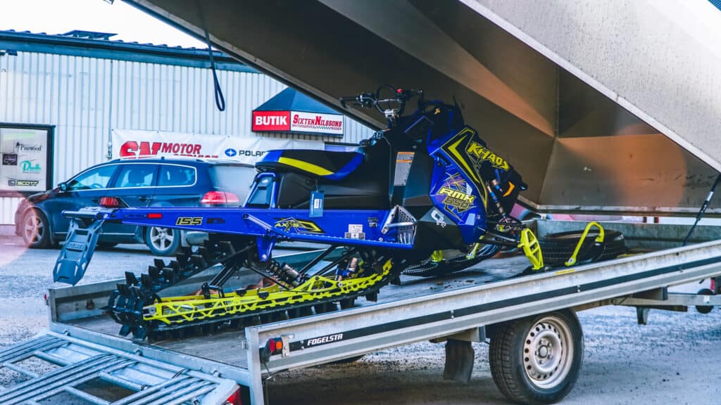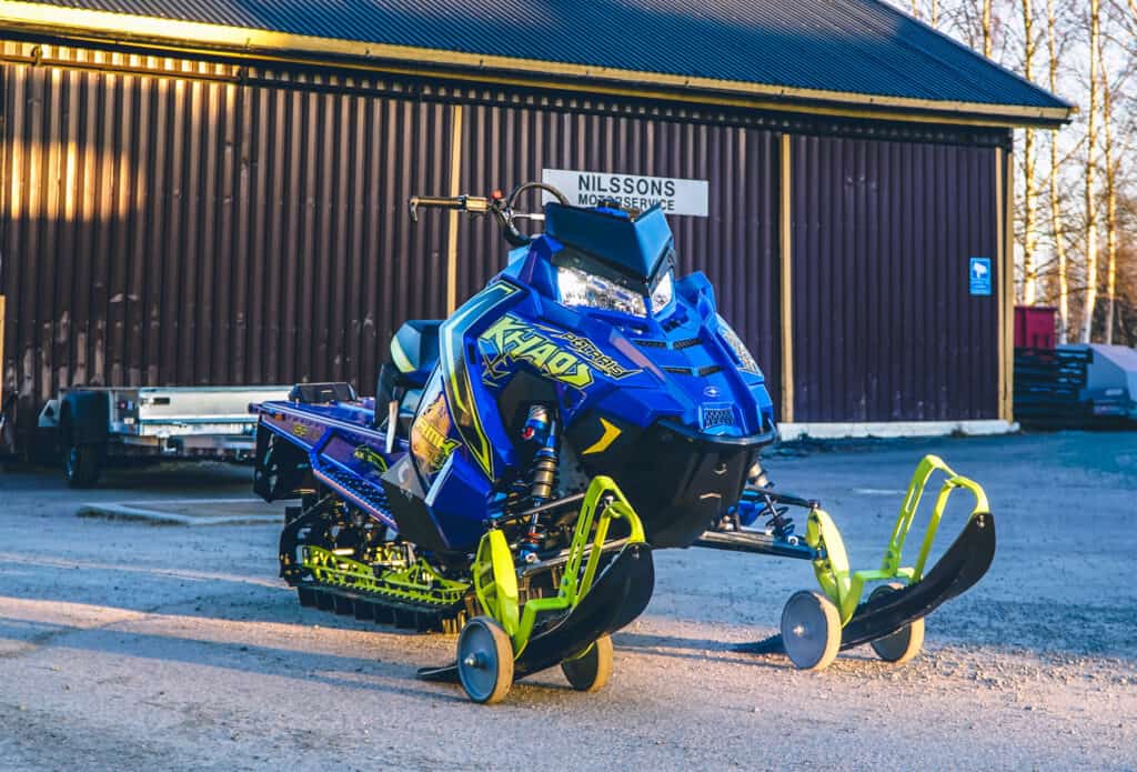 På väg ut för att lasta Polarisen passerar vi verkstaden och dialogen fortsätter. Vi blir informerad att Polaris nu erbjuder marknadens längsta garanti på hela 5 år vilket känns tryggt. Förväntningarna är skyhöga på årets Khaos och Emil som provat maskinen i våras lovar att busfaktorn är stor. Väl ute dras motorn igång och får gå under tiden släpet tippas ner, det känns ovant för undertecknad som kört fyrtaktare dom två föregående säsongerna men ändå så rätt. När Khaosen körs upp i släpet skenar tankarna iväg till midjedjupt puder och allt som ska hinna upplevas med denna maskin. Det är med en bra känsla kåpan dras ner och vi åker hemåt. Samma kväll torrbrytandes i garaget känner undertecknad lika stor längtan till snö som sin 6-åriga dotter efter jultomten. Kung Bore PLEASE! Let it snow…