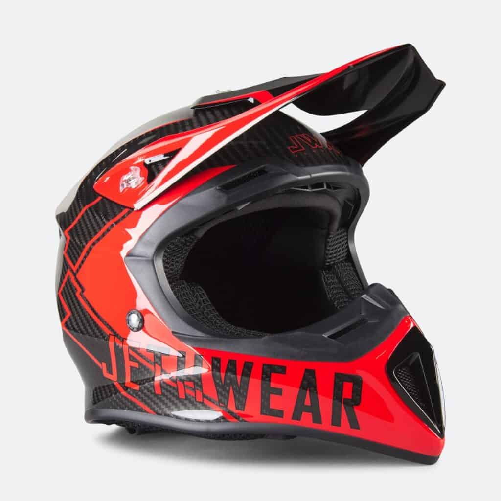 Jethwear har utvecklat en egen hjälm där skalet är tillverkat i glasfiber och kolfiber för att hålla ner vikten. En uppgift som kan vara svår men med en vikt på 990 gram (+- 50g) måste vi säga att de har lyckats riktigt bra här! Stilren design som matchar kläderna och kolfiber som syns mellan grafiken ger ett läckert utseende. Hakremmen sitter med säkra D-ringar.