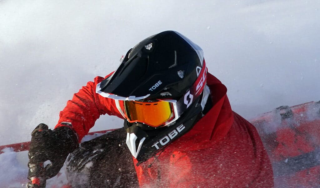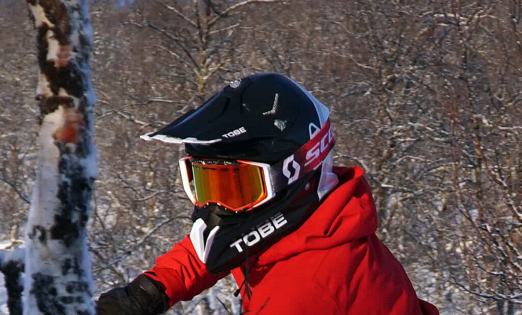 Tobe´s samarbete med Airoh var ett lyckat drag, en grymt lätt hjälm med snygg design och bra kvalitét. Under vintern har vi testat den i olika väderförhållanden och den passar bättre i vårt tycke när det inte är dom kallaste dagarna på året. Hjälmen är trots allt utvecklad för motocross där man vill ha så god ventilation som möjligt, och den fungerar även utmärkt för den aktiva skoterföraren som blir väldigt varm. Passformen är riktigt bra och tillsammans med den låga vikten känner man knappt att man har en hjälm på sig. För att hålla nere vikten är hjälmen väldigt tight kring ansiktet och det är lite för trångt för goggles med ett större nässkydd, vi valde dock att modifiera lite i skumgummit framför näsan och på så vis fick större nässkydd plats.