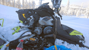Landskapet är magiskt, gassvaret riktigt bra även om varvtalet svajar något. Kanske den inte är helt ur inkörningsprogrammet än. Ser 7800 stundtals och ibland 8350. Gissar att det skiljer ett trettiotal hästar på de varvtalen, låter det vara ett tag för att se om det går till sig. 1,2 mil senare enligt mätaren så smäller det till och motorn hinner tokvarva i nån tiondels sekund innan gasklykan släpps. Förbaskat, första remsprängningen är ett faktum. Det här känns inte bra, variatorerna känns glödheta och så även remresterna. Inga bra tecken faktiskt då körningen inte varit speciellt extrem.