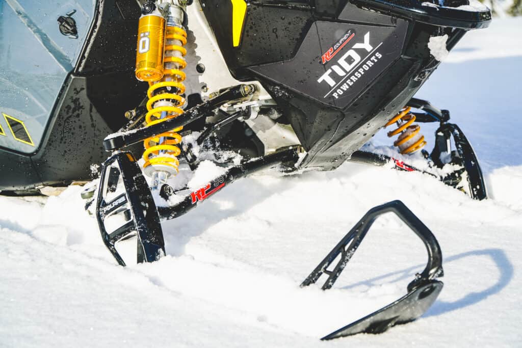 Något vi kom underfund med vid det första körningstillfället var att detta är något helt annat än de 155” maskiner vi tidigare kört, här har man tagit ”busfaktorn” till helt nya nivåer. Inte bara de faktum att man var som helst kan dra upp skotern på vändhjulen, utan även med den lättsamhet man upplever när man hoppar över bäckar och andra hinder som kommer i ens väg. Det kan dock bli för mycket av det roliga och när man skall ge sig in i skogen för att klättra upplevde vi det nödvändigt att justera upp bakdämparen för inte tappa farten då skidorna skidorna annars lätt vill titta upp mot skyn. En justering som denna går bra att göra med originaldämpningen som för övrigt är väldigt kapabel, men för att få ett bredare spann av justering samt ta luft för kommande flygturer var vår första modifiering att byta stötdämpare till en uppsättning från Öhlins.