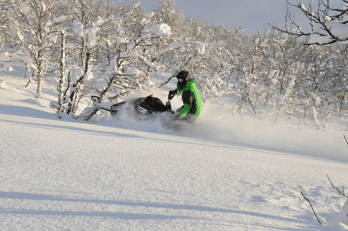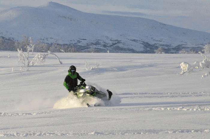 När vi närmar oss puderhålen runt Gautosjö är det svårt att hålla sig på leden längre. Gashandtaget trycks in och med skidorna i luften viker vi ut i lössnön. Så länge gasen kläms in åker man med skidorna i luften, det är bara så. Pudret formligen sprutar som en dusch över både skotern och föraren. Snömängden är nästan overklig, är vi i Kanada eller i Norrbotten?