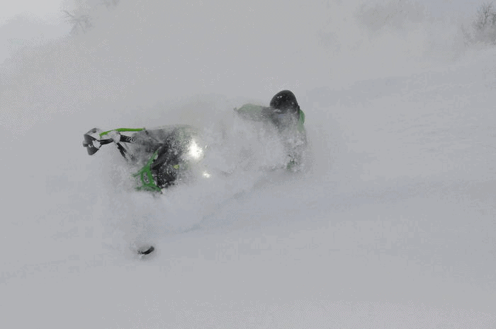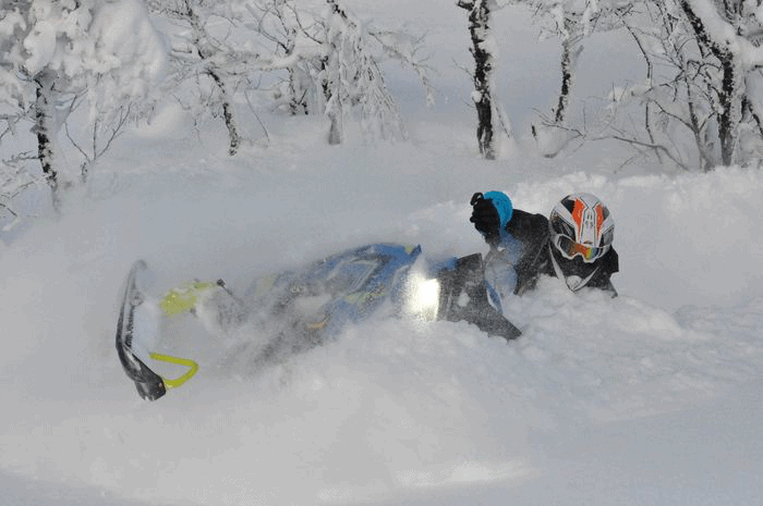 Här sätts framkomligheten verkligen på prov. Snön som bitvis når 160 cm och mer i drevsidor, kan lätt fånga den som inte vill kliva upp ur snön. Men Summiten är en av stjärnorna på just den biten. Vi stannar till för att fylla på energidepåerna. När vi ska iväg igen inser vi att vi parkerat i ett lätt motlut och förstår vårt misstag när vi börjar gasa. Snön är inte bara djup, den är riktigt kompakt och seg på något vis. Någon blir kvar (spade fram), men inte Summiten. Första tanken är att, ”här blir det problem”, men Ski-doon poppar upp ur snön som utskjuten ur en kanon.