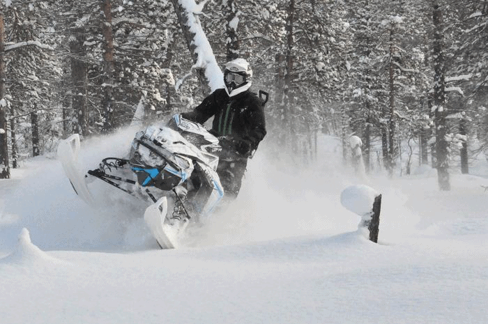Vi fortsätter på temat träd. För när det blir riktigt trångt och stökigt briljerar Polaris 800 PRO RMK 155″. Det lugna trygga uppträdandet gör att man alltid vet var man har den och det är en enorm fördel när man snirklar sig fram mellan saxofonbjörkar och torrfuror. Oavsett om det är brant eller inte. Sedan har den en närmast fenomenal förmåga att kliva upp ur snön. Spelar ingen roll hur sakta det än går, eller om det till och med rent av står still, fullgas och lite gungande, så kliver RMK:n upp och iväg.