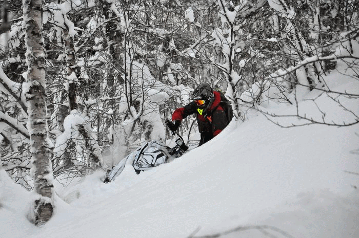 Skråkörning är definitivt en av PRO RMK:s paradgrenar. Skotern skär genom snön som en varm kniv genom smör och det är egentligen bara att krypa närmare bergväggen och hänga med. Inga bekymmer att ändra riktning eller justera höjden när man kravlar sig fram längs sluttningen. Dyker det upp en björk framför en (var kommer alla dessa träd ifrån?!) är det busenkelt att korrigera kursen och passera antingen ovanför eller nedanför. Sedan tar man bara ut riktningen igen och fortsätter som om inget hade hänt.
