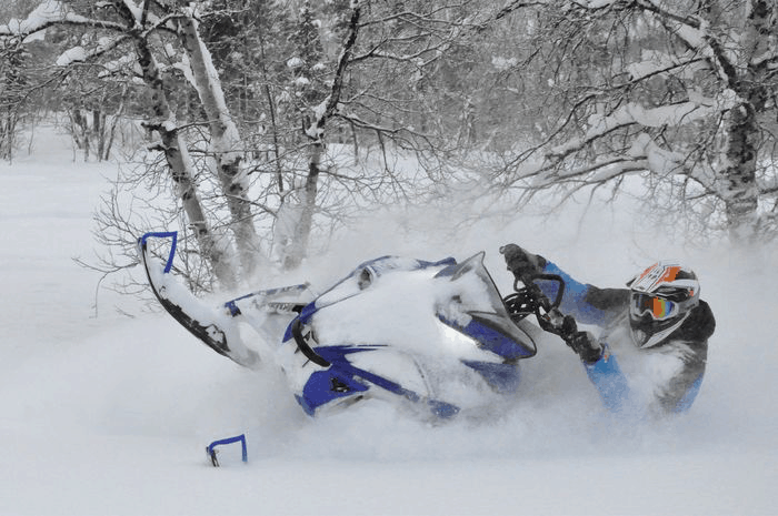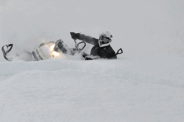 Alla som någon gång befunnit sig i en liknande situation med en tvåtaktare, vet förmodligen hur man tar hjälp av maskinen genom att gasa och låta mattan gräva undan snön så att man slutligen står på någorlunda rätt köl igen. Detta funkar ju inte med en maskin som inte startar, så det gäller att inte slarva med sommarträningen… Men det gör väl ingen av er där ute, så vi lämnar detta.