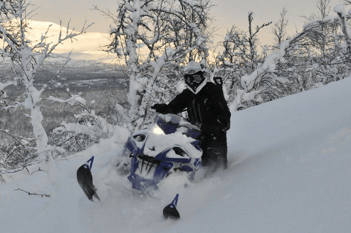 Men ner kommer man ju allt som oftast, om inga vandringsbjörkar eller annat sattyg kommer i vägen och då är det bara att ta nya friska tag. Upp igen! Andra vändan har man förhoppningsvis lärt sig något om vägvalet och kan ta sig en bit till uppför berget. En sak kan vi i alla fall konstatera, Yamaha Sidewinder M-TX LE 153″ är en hiskelig klättrare uppför glest bevuxna fjällsidor. Kraften tar aldrig slut och det bara matar på. Vore bara mattan försedd med ännu större paddlar än 3″ monstren som redan finns där, skulle den nog kunna klättra vidare, upp i tomma luften efter att själva fjället nått sin topp!