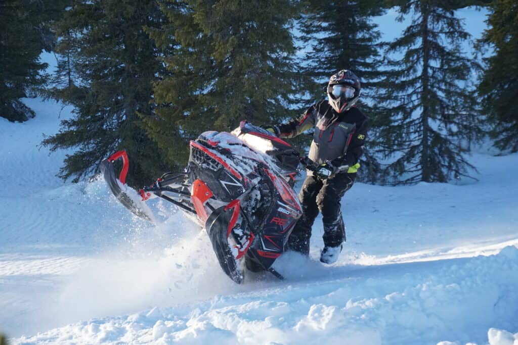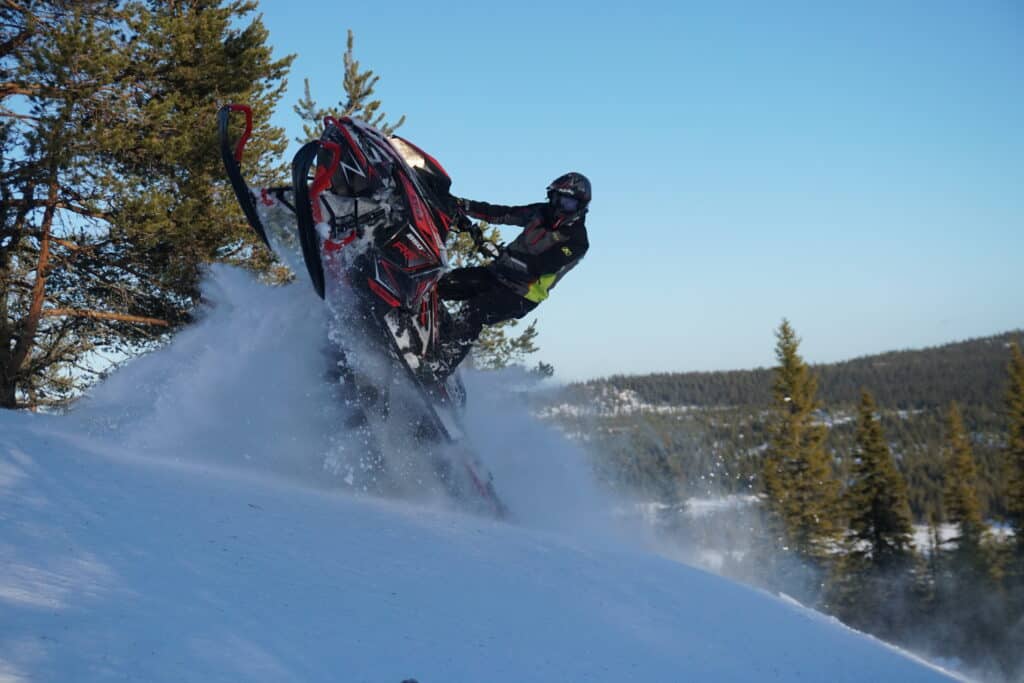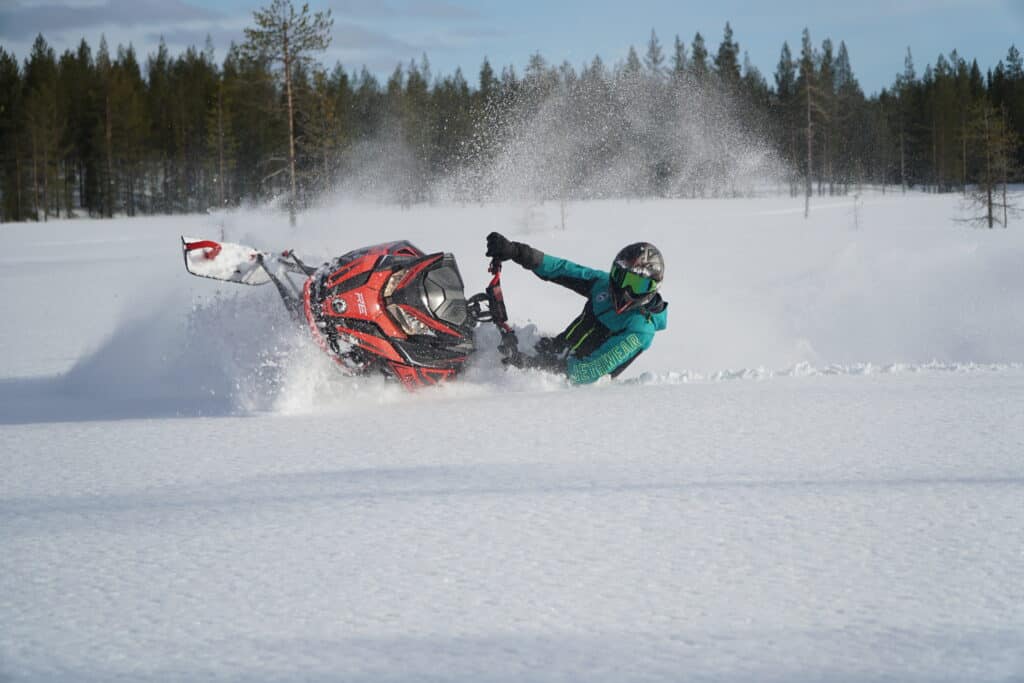 Den kliver inte riktigt lika lätt upp ur snön som sin bror med beteckningen DS istället för RE, men den är inte långt bakom. Här förvånar den till det positiva. Branta linjer klarar den upp med bravur, skråkörning lika så. Den imponerar nästan överallt där vi drar fram. Hade det suttit på tretumsmattan kanske den poppat aningen lättare, men vi får helt enkelt leva på lite mera trackspeed.