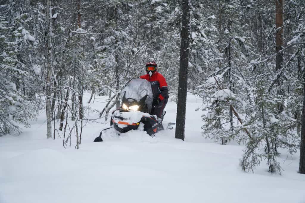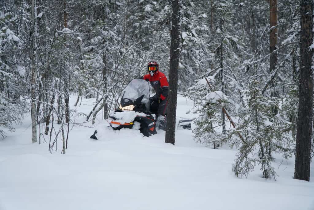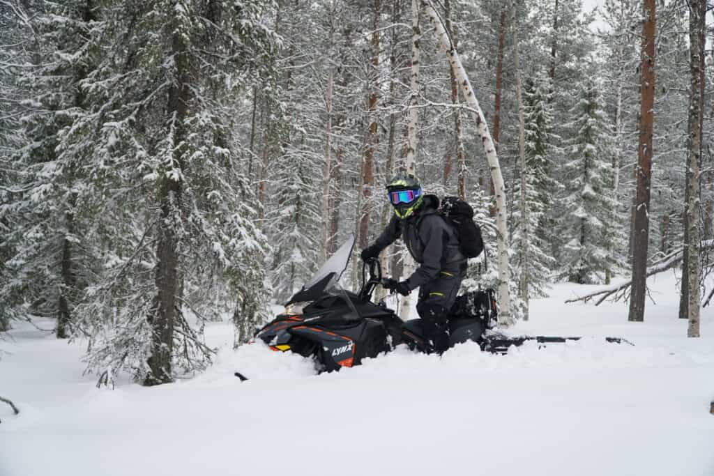 Sedan bränner vi iväg längs leden och LYNX COMMANDER 900 ACE TURBO ger ett bra förstaintryck då motorn bjuder på en riktigt trevlig karaktär, en fin gasresons och den skjuter iväg ordentligt när gashantaget pressas lite extra längs leden. Här märks det att det inte snålas med pulver under huven. Vi möts givetvis av ett extremt skönt ljud som bara en fyrtaktsturbo kan leverera, det är nästintill hårresande av ren njutning när ljudet mullret kommer ikapp. Den 50cm breda mattan med en kamhöjd på 44mm ger ett fint grepp längs den packade leden och maskinen upplevs väldigt stabil även vid de lite tvärare kurvtagningarna. Fjädringsmässigt bjuder den till på väldigt fin komfort och sväljer ledens gropiga partier och färden fortsätter utan problem.