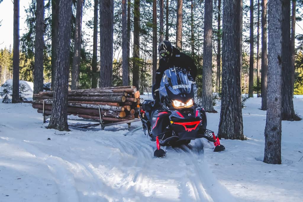Vi börjar vårt arbetstest med att ge oss i kast med veden som ska värma hus och stuga nästa år. Efter svettiga timmar med motorsågen i hand är det till slut dags att börja med det roliga, att dra fram stockarna till gården. Vi konstaterar att det är en fröjd att arbeta med maskinen, den har kraft i överflöd och de tunga vedlassen på timmerdoningen är lätta att ta hem. Skidorna håller sig på marken och styrförmågan finns kvar hela vägen genom kurvorna, fjädringen gör att maskinen är behaglig att åka på och sammantaget ger det en känsla av stabilitet och trygghet trots rejäl påfrestning av lasset bakom.
