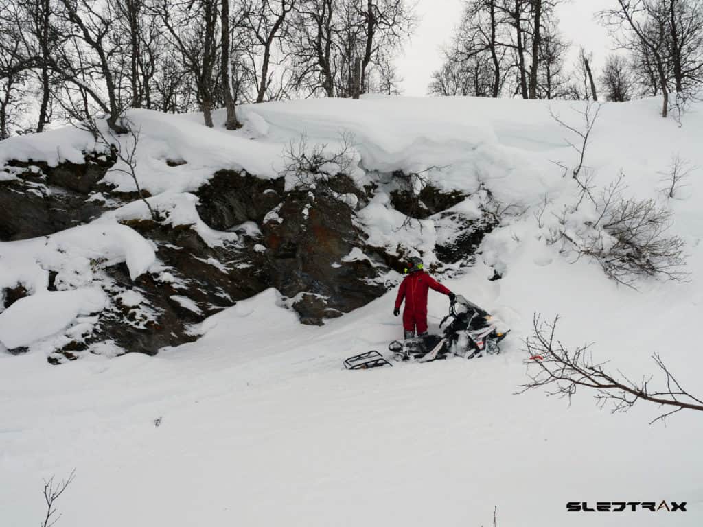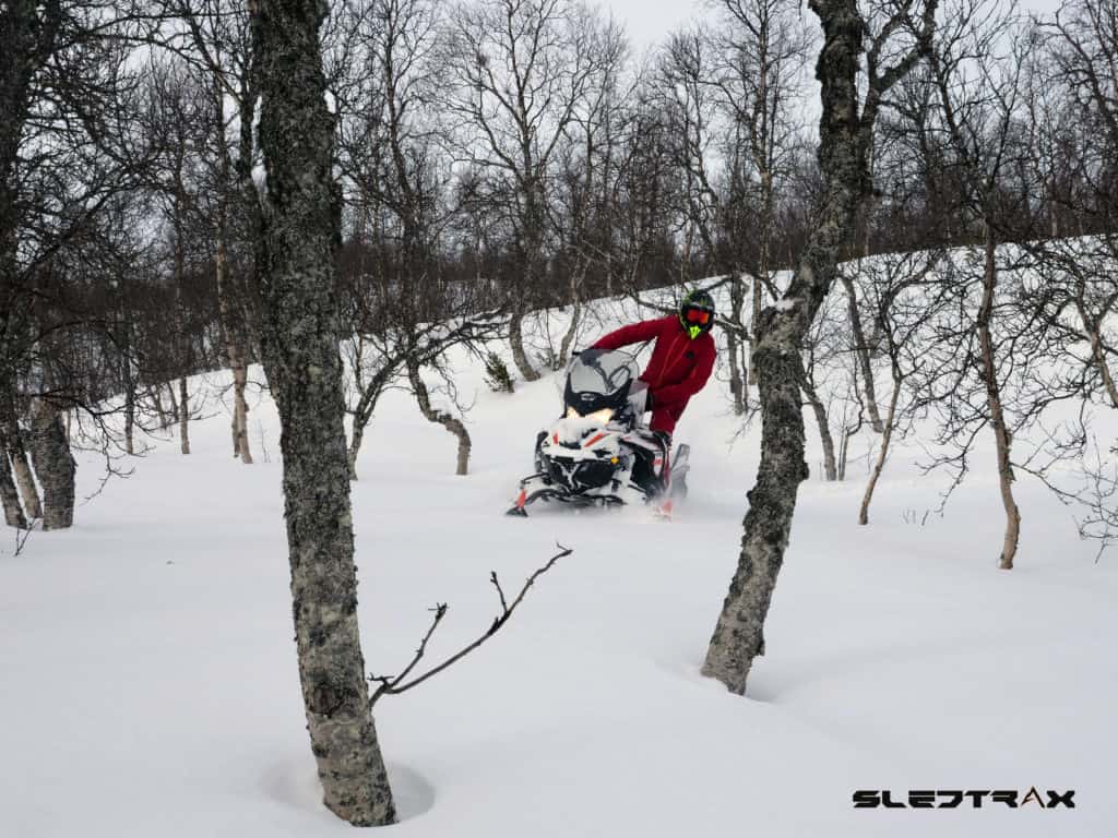 När leden är avverkad så breder vidderna ut sig, med fjällets björkar och härliga kullar av vitt guld, så spritter smilbanden upp. Nu kommer den smala framvagnen, den långa mattan och den ruggigt fina balansen till sin rätt. Vi provar att burka och snirkla lite snabbare mellan vegetationen. Här trivs Ranger 49 som fisken i vattnet. Efter ett misstag på en fjällknöl åker maskinen med förare ofrivilligt in under en björk utan åverkan på skotern.