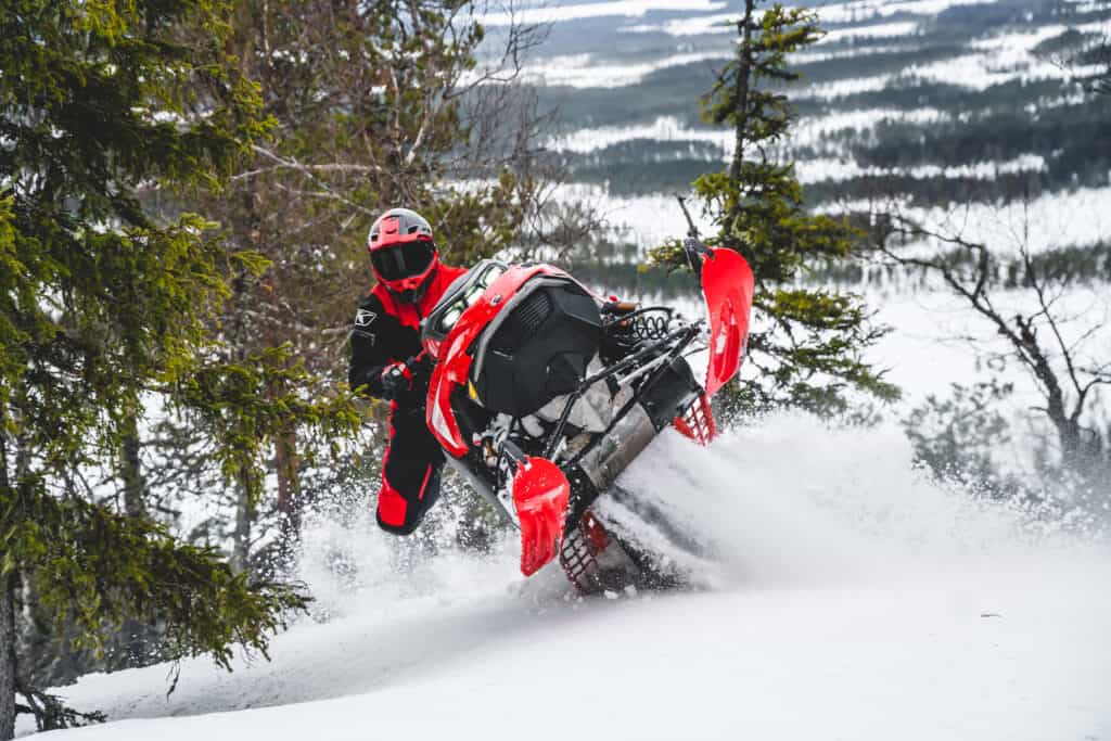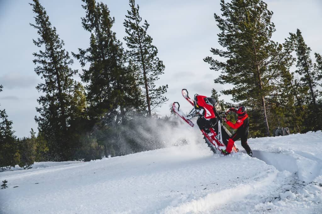 När vi fick möjligheten att provköra en prototyp av Lynx Shredder RE 3700 850 E TEC Turbo R nappade vi direkt och tog med oss skotern ut i skogen för att se vad detta är för en skapelse. Om än snöförhållanderna hade försämrats radikalt under de senaste dagarna och körningen fick ske i riktigt tung blötsnö var det med ett enorm leende på läpparna som vi tog de första reporna upp för backarna. Med denna överladdade motor är det nämligen inga problem att hålla varven på topp trots krävande snö. När varvräknaren passerar 7000 finns det inget som stoppar denna hysteriska maskin, det är känslan i alla fall. Det läckra turboljudet fräser på och det drar i armarna när man åker iväg upp för backarna. Den största risken är nog att man stegrar över om man inte passar sig, för bakbåge och annat utstickande krafs är borttaget på denna modell. Det går därför både enkelt och snabbt när man väljer att vända i backarna.