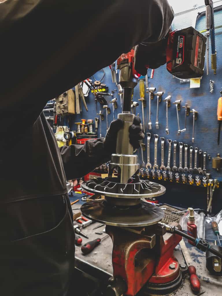 Ulf på Allservice slår en signal, de har ett återbud så det finns tid att sätta in variatorkitet vi fått hem från modshop. Som tur är har temperaturen sjunkit från bitande – 25°c till ett mildare snöväder. På plats står skotern i fråga redan isärskruvad och redo för montering av produkterna. Eftersom denna pilot själv inte har kunskap och nog med erfarenhet för denna typ av skruvning så är mekanikern Olov från Allservice på plats, med hans kunskap och erfarenhet ser allt lekande lätt ut. Sekundärvariatorn är snabbt isärskruvad och därefter tas helixen ut. När allt är ute så ser vi att rullarna sjunger på sista versen så vi passar även på att byta dem. Så ett tips, se till att slänga ett öga på dem om ni ändå är i farten. När nya fräscha rullar sitter på plats är det dags att sätta in den nya fjädern samt helixen, detta gör Olov på ett kick!