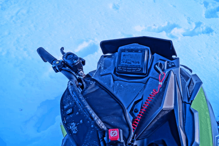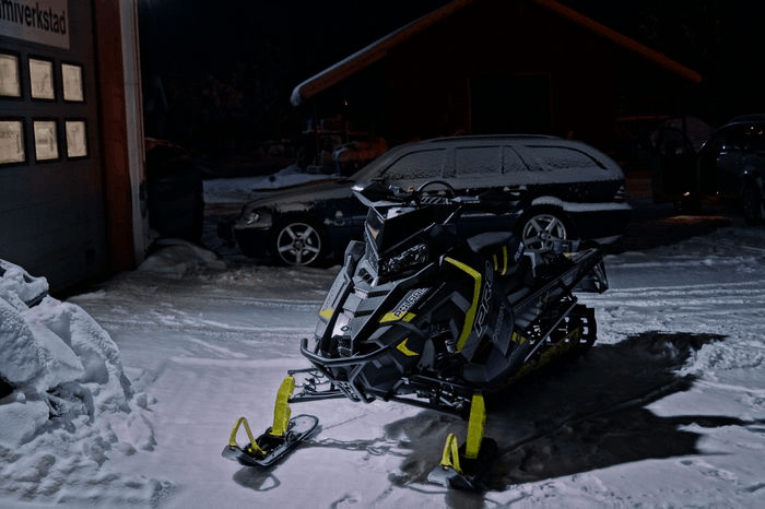 Nu fattades bara snön och den skulle lysa ganska länge med sin frånvaro, många vändor med snö och nästa sekund töväder. Allt växlande mellan varmt och kallt tärde rätt hårt på psyket och speciellt med en maskin på gården i längden 163 tum. 121 tum kändes som en lämpligare längd just då. Men den som väntar….. Inkörning kunde i alla fall inledas, för isar hade det blivit. Motorn började med att gå ordentligt rått, inget ovanligt för en tvåtaktare med andra ord. Första turerna så ville inte motorn upp i mer varv än 7700. Trots att man inte ska gasa på något kopiöst från början så måste man ju allt testa en aning. Varvtalsspärren slapp ganska omgående fast det tog nästan 5-7 mil innan motorn riktigt ville börja samarbeta, och ytterligare ett par till innan all rå motorgång var borta.