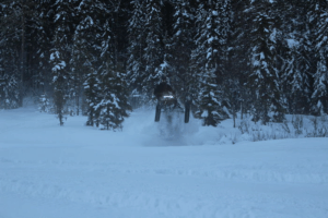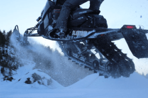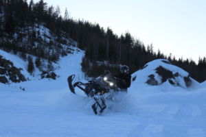 Assault har bred framvagn. Det känns stabilt, men ibland lite styltigt längs leden. En kalibreringssak såklart, men är man van att åka lössnömaskin blir det lätt hårt med en ledkalibrerad framvagn. Det i sin tur inbjuder såklart till att åka riktigt hårt längs leden och det gillar hela maskinen så då är allt frid och fröjd. Men det är ju en crossover, så då funkar den väl på sidan av leden? I ärlighetens namn så har denna maskin numera mer gener från ledsmiskarna än lössnösidan eftersom dagens lössnöarna skenat iväg i utvecklingen. Men visst, det går fint att skråa och göra roliga hopovers i branterna, och man kan ta sig fram mellan björkarna även om framvagnen på grund av sin bredd hindrar en ibland.