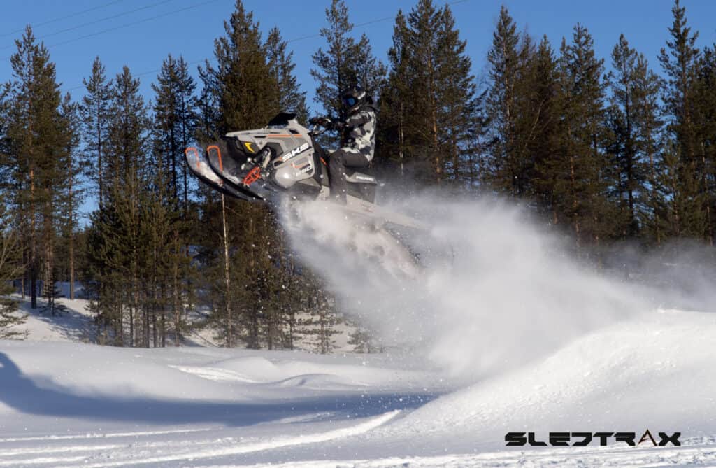 På de flesta lössnömaskiner i dagsläget finner vi allt smalare framvagnar. På SKSen har de däremot valt att behålla den med 39 tums bredd och dubbla kylare. Detta för att bevara ett bredare användningsområde. En framvagn som funkar bra i såväl lössnökörning som ledkörning och dubbla kylare för dem som vill haka på en pulka eller liknande, vilket är något som verkligen uppskattas hos de som söker en maskin med mångsidighet. Det är fortfarande en grymt potent lössnömaskin även om PRO RMK modellerna är snäppet extremare på det området. Något som lever kvar i SKS modellen är även kedjehuset till skillnad från PRO RMK som har belt drive. I framvagnen hittar vi även där något som är bekant sen tidigare år, ställbara Walker evans dämpare.