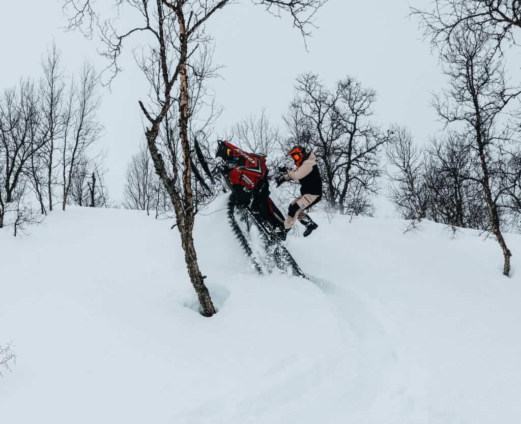Förbaskat kul vore det enkla att säga men låt mig utveckla. Att bomba hängdrivor och åka på skrå i mer eller mindre vertikala branter är just det KHAOS är byggd för. Förutom att det är läskigt till och från är det otroligt kul. Adrenalinklockan slår helt klart i topp när man busar runt i fluffet med detta lössnömonster. Att maskinen är 163″ i längd gör faktiskt inte sån stor skillnad som man skulle kunna tro vid bus. Detta eftersom QD2 driften spolar upp mattan i rasande takt och körningen lever mycket på mattspinnet vilket gör att vändningar och rullkörning är lekande lätt. Tvärtom är längden till fördel vid skråkörning och i branta backar har man rejäl hjälp av extra fästet som 163 tummaren ger.