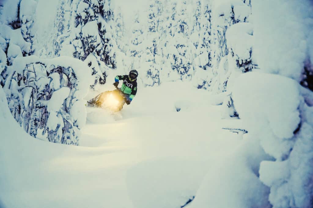 När energin börjar återvända kopplas hjälmlampor på och ivriga var vi på pucken igen, eftermiddagens flatljus var nu utbytt mot skarpa konturer och det kändes som att vi svävade fram i en sagoskog. Träden reflekterade av hjälmlampans starka sken och det som en gång varit en grön skog såg nu närmast ut som ett landskap med gigantiska snöstrutar. Det kändes faktiskt en gnutta overkligt att få köra i sådan miljö redan den första riktiga turen för säsongen.