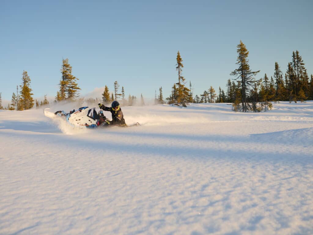 Polaris Khaos är redan en extremt potent lössnömaskin från fabrik och trots många stora modifieringar är skillnaden mellan vår projekt maskin och en stock Khaos relativt små. Men den största förändring man känner av är dämpningen från DBC – Sweden och Fox. Med möjlighet att smidigt kunna ändra sättningen från soft-medium-firm-lock med en knapptryckning från styret blir det väldigt enkelt att få optimerad fjädringsinställning hela tiden för all typ av körning. Även den höjda framvagnen från Z-BROZ Racing och den nya geometrin från Z-BROZ Racings spindlar gör maskinen ytterligare något steg smidigare vid teknisk körning. Framförallt vid tvära kast i brant terräng med mycket träd.
