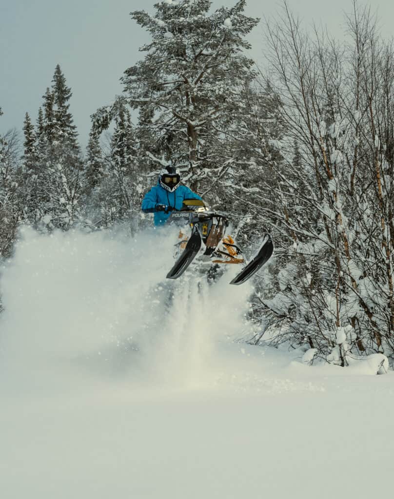 Vi hittar ett mindre skutt, ett så kallat ”pillowpopp”, och det är dags att testa fjädringen som inte går av för hackor. Ett set Öhlins stötdämpare tunade av Mikael Nordström och Öhlinscenter ger precis den tryggheten och stabiliteten som undertecknad förväntar sig. Lika odramatiskt som upphoppet är landningen och man känner att fjädringen är perfekt inställd för just bus och lek i snön.