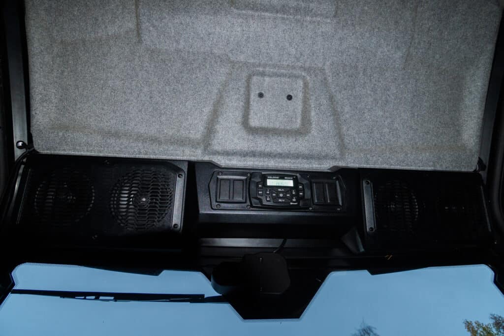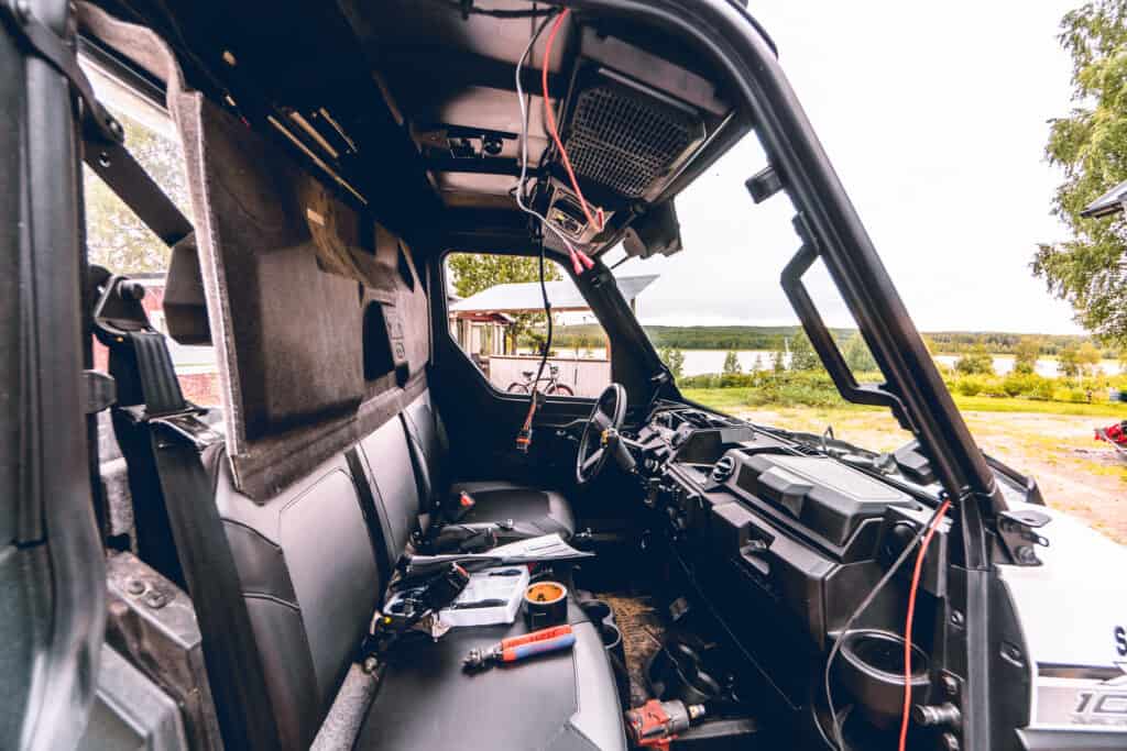 När väl alla kablar var på plats var det dags att montera ihop inredningen igen för att sedan montera en baslåda under passagerarsätet, denna passar med det medföljande fästet som skruvas vid förmarkerade märken i golvet. Den takmonterade stereon som innehåller själva styrenheten monteras enkelt i förberedda hål i själva ramen för hytten och säkras med några skruvar. Nu har vi en stereo på plats som även har radio, aux och blåtand. Med fyra stycken 6,5” högtalare i taket med 300w förstärkare samt en 10” bas på 250w kan vi lova er att det är riktigt bra ljud i grejerna. Plogsvängarna i vinter tillsammans med lite hästjazz i högtalarna kommer att höja trivselfaktorn rejält.