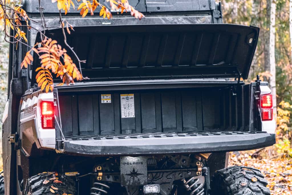 Ett annat tillbehör som tillkommit under sommaren är ett flaklock som vi fick upp ögonen för, kanske mest för att vi hade både snö och is på flaket under vintern. Men vi hoppades även på fördelar under sommarhalvåret då man kan stänga ute damm och regn. Monteringen är superenkel med Polaris Lock & Ride system som gör det möjligt att montera samt demontera locket på någon minut. Locket är byggt så man kan öppna halva locket och i skarven är det en tätning som förhindrar vatten att ta sig in, man vrider ett kvarts varv på Lock & Ride fästet och sen öppnas locket nästan automatiskt då det även sitter två små gasfjädrar som hjälper till.