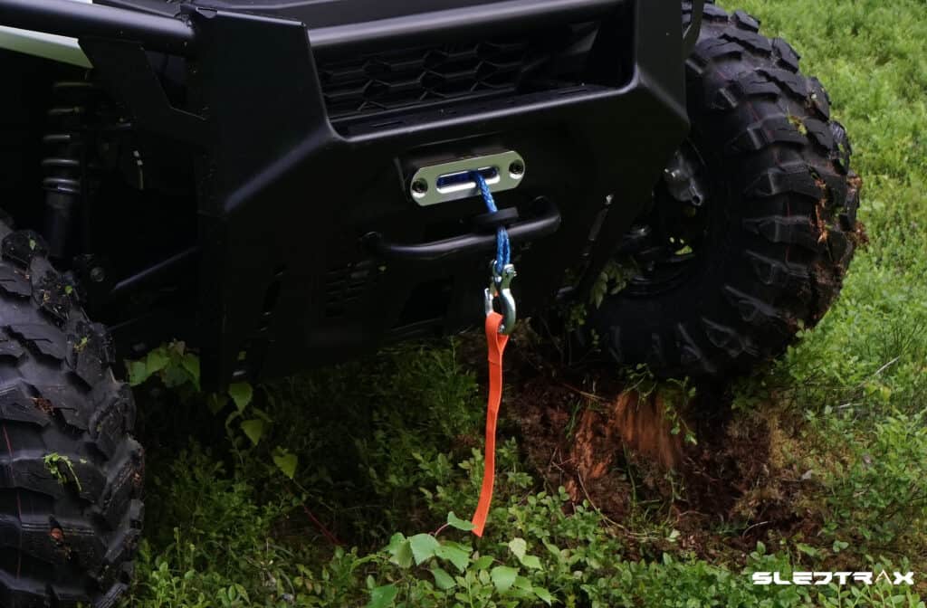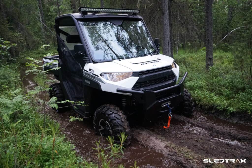 Det kanske mest viktiga på en atv eller utv i vårt tycke är en winch som kan behövas när man kört fast själv eller om kamraten sitter fast i leran. Den vi har valt är en heavy duty modell från Polaris som kan wincha strax över 2000 kg vilket räcker till att dra lös maskinen även med last på flaket.