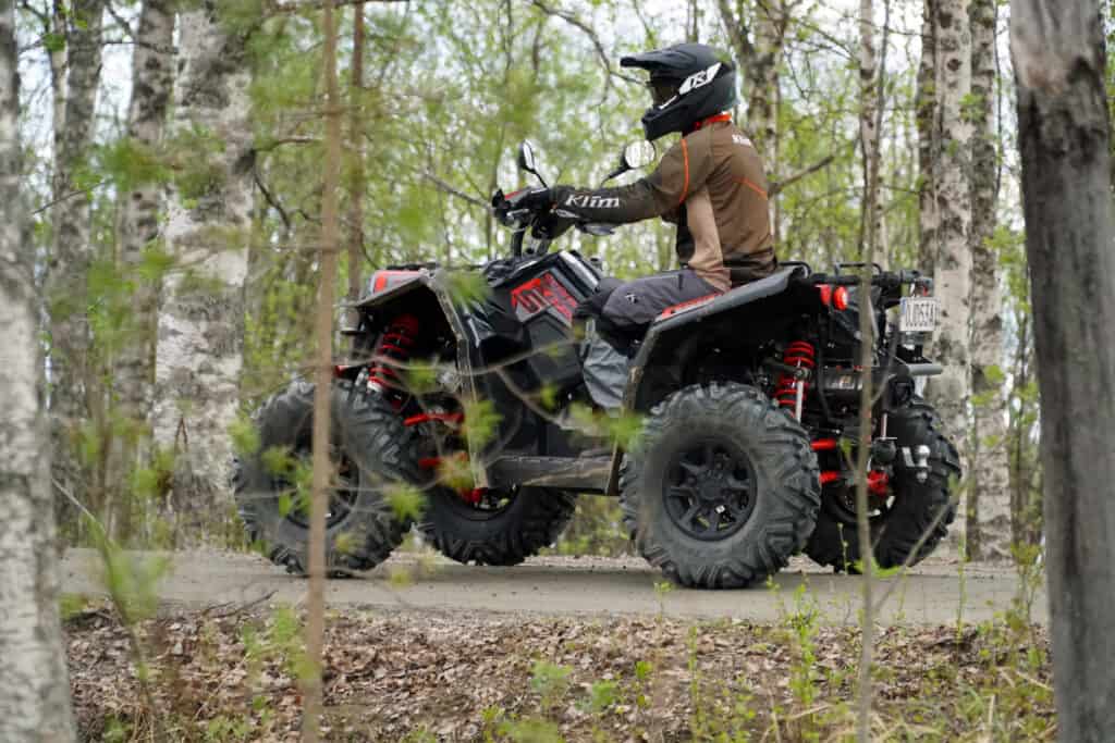 Vi kör längs en skogsväg som är väldigt kuperad. Här får de rejäla stötdämparna på Scramblern arbeta med alla olika typer av ojämnheter, och vilken fjädring det är i maskinen. Några slag i styret eller domningar i baken är det inte en minsta tillstymmelse till. Stötdämparna känns väl avvägt kalibrerade och det är lätt att de går lite för fort utan att märka av det eftersom Polarisen upplevs så behaglig i terrängen. Vi anländer till några sanddyner där vi äntligen får pressa Scramblern för allt vad den går, och jäklar så kul det är!