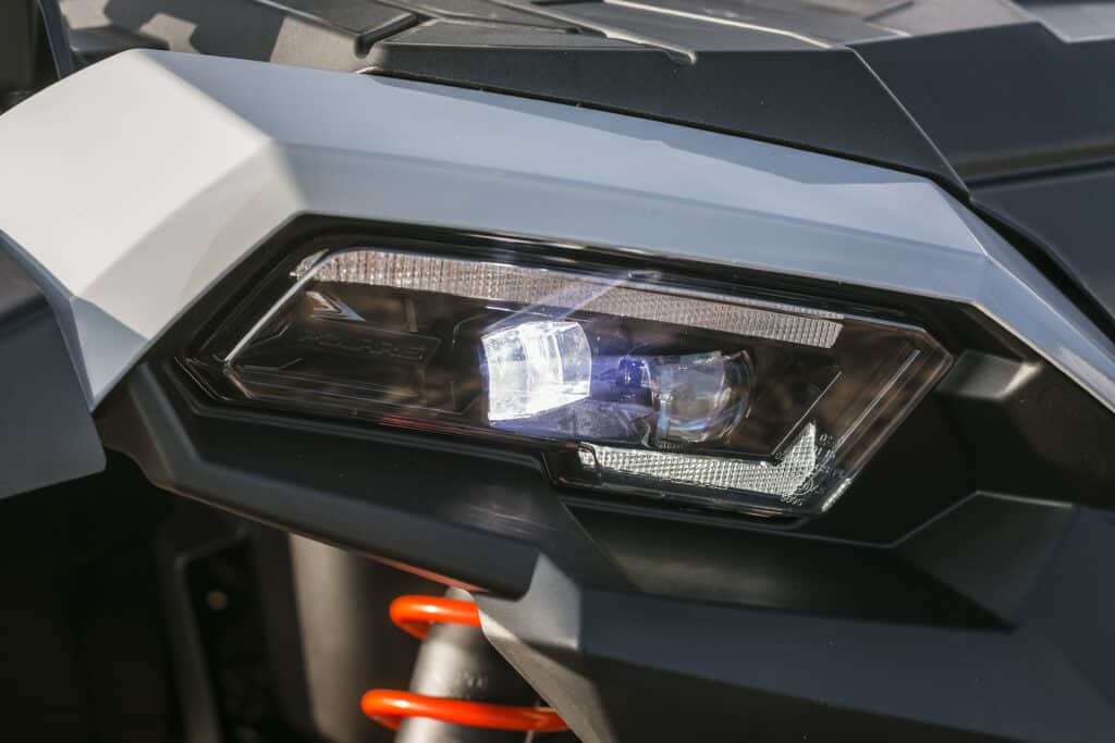 För att match den kraftiga konstruktionen har man även fokuserat på att fjädringen inte ska vara det som stoppar framfarten, framvagnen har hela 35,5cm lång fjädringsväg och 29 cm i bakvagnen. Det mest utsatta på en atv kan vara de nedre A-armarna i framvagnen, det är här som eventuella stenar och stubbar träffar först. Därför har Polaris gjort böjda A-armar som ser till att man får lite extra spelrum mellan mark och maskin, en enkel men smart lösning.