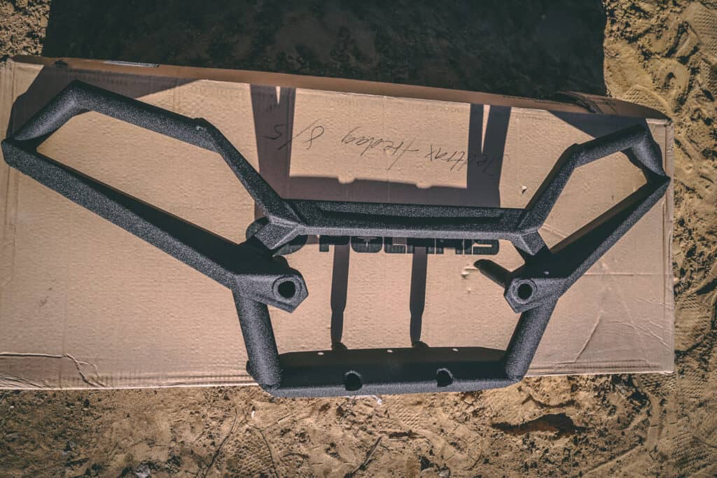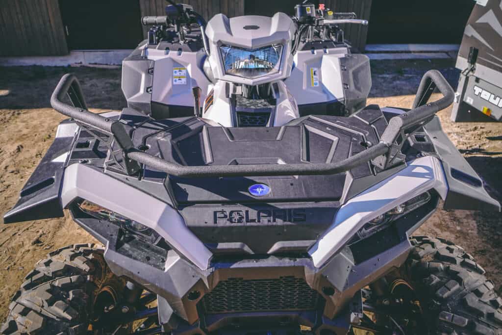 En atv kan användas i många miljöer och i Sverige blir det en hel del skogsterräng när man kanske kör timmer eller hämtar hem en älg på jakten. Då är det också fort hänt att man stöter i träd eller stenar som kan skada maskinen. Vi har testat en frontbåge på vår Sportsman 1000 S och det är ett originaltillbehör från Polaris som ska ge maskinen extra skydd.