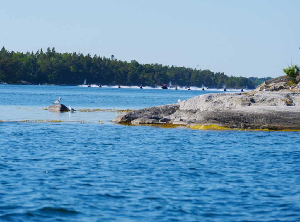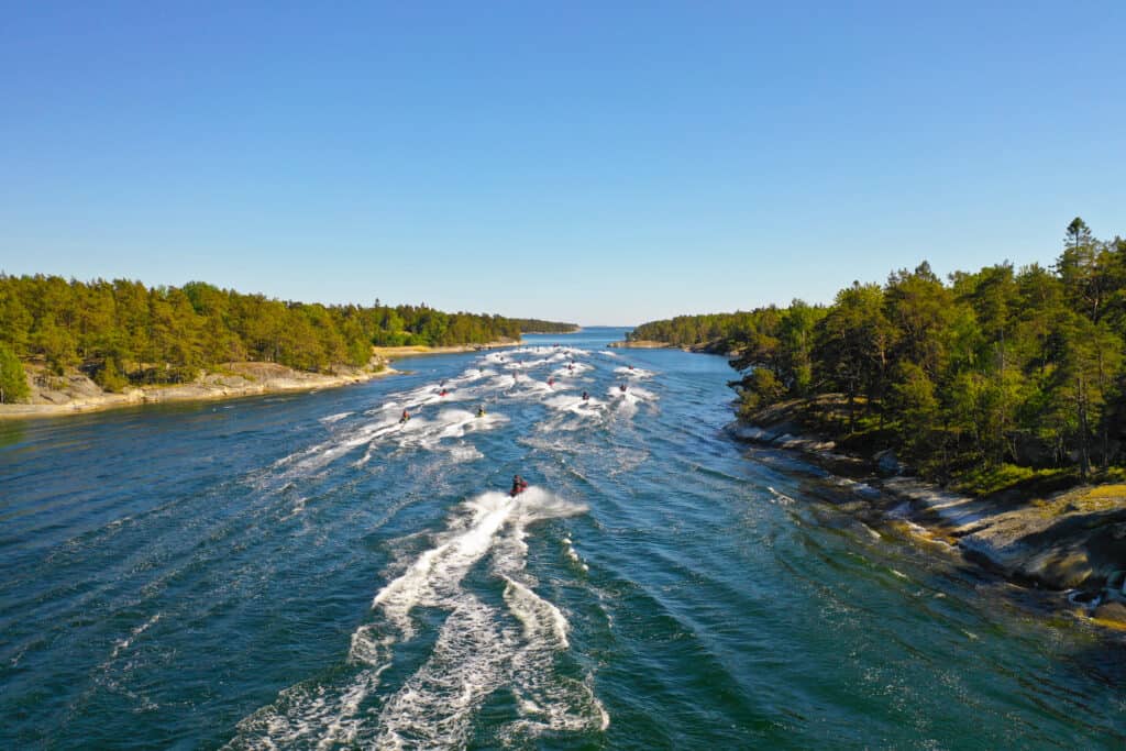 Under en klarblå himmel och strålande sol påbörjades Cruising day och med en ribbåt ledandes i fronten och en rescue båt längst bak gick färden genom Djurgårdskanalen ut till ett första tankstopp vid Lidingö. Känslan att få köra vattenskoter tillsammans med 49 andra är något helt annat, här gäller det att ha koll åt alla håll och kanter och ligger man bakom ”klungan” blir det väldigt grov sjö och svårt att se av vattensprutet vilket inte gör saken enklare. Dock hade jag och min vän Jonathan en bra ide om att ligga något längre bak i fältet för att få en bättre överblick.