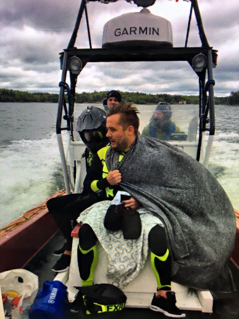 Med en noggrann säkerhetsgenomgång under morgonen gör killen bakom mig säkerhetstecknet i praktiken och alla bakom mig bromsar ned och kommer till undsättning. Några minuter senare är jag uppdragen ur vattnet och sitter jag på en rescue-båt på väg in mot land och ambulans.