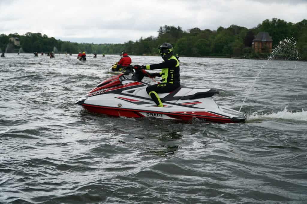 Vi lägger oss guppandes längs en osynlig startlinje, den trevliga atmosfären med skratt och lek är som bortblåst och växlas mot stundens allvar och tävlingsanda. Djävulshornen växer ur pannan och när startskottet går pressas maskinen till allt vad den går för. Accelerationen är enorm och 1800 cc motorn jobbar för brinnande livet. Vatten sprutar åt alla håll och undertecknad tar tidigt en linje ut till höger för att minska vågmotstånd från maskinerna framför samt för bättre sikt. Yamahas racepiller mellan benen känns följsam och säker, att den delar skrov med Yamaha GP1800 som är byggd för race känns verkligen igen i ergonomin och stabiliteten.