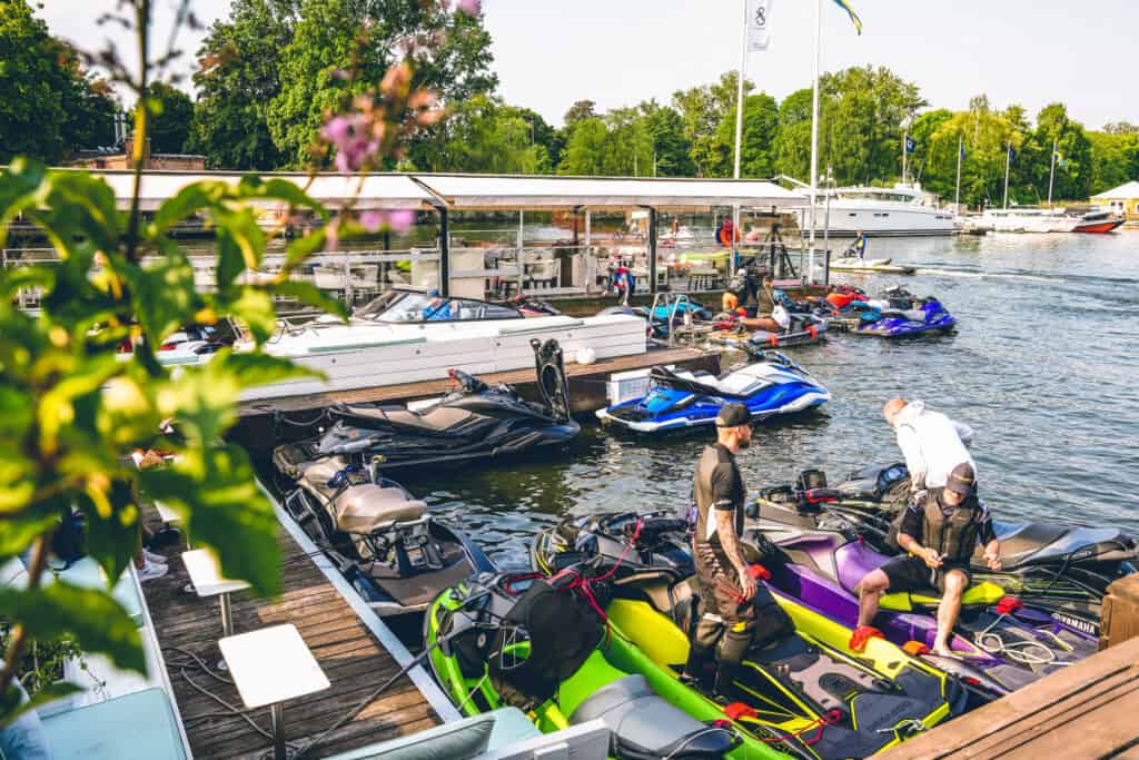I sedvanlig ordning möttes alla på Strandbryggan som ligger längs Nybrokajen vid bron mot Djurgården. En kaffe/fralla frukost avnjöts under tiden Niklas gav deltagarna en rigorös säkerhetsgenomgång. Tydligt och seriöst! Tummen upp!! Någon timma senare och med en goodiebag från Yamaha Marine i hand var det så äntligen dags. Vi började puttra ut i strålande solsken mot Nacka Strand där starten skulle ske. Att åka med 50 andra vattenskotrar vid sin sida är något man bara måste upplevas. Sjukt mäktigt.