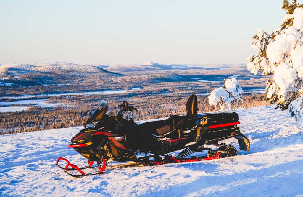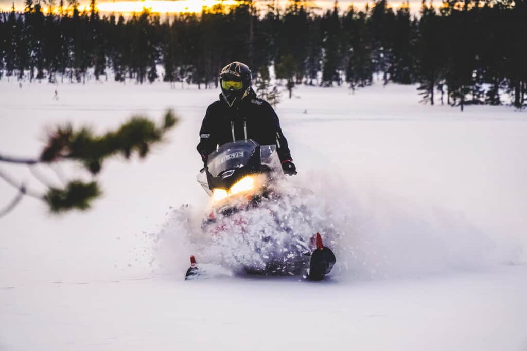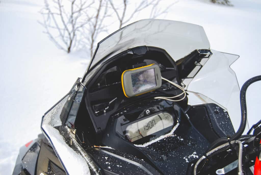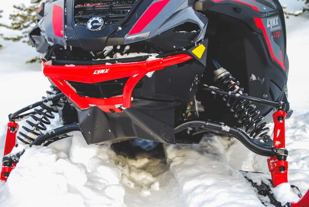 Nästa utflykt bar i väg till djupsnöns förlovade land, där de kraftiga vindarna drivit ner fluffig nysnö i dalgångarna kring lågfjällsmassivet med meterdjup porös snö som resultat. Som vi längtat efter att testa Lynxen i dessa förhållanden! Men inför mer äventyrlig körning kan lite säkerhetstänk också vara bra, för man vet aldrig vad som kan lura under snön. Här kommer nog det förmonterade Heavy Duty bukskyddet väl till pass. Det har mycket bra passform och det känns tryggt med en extra skyddande plast för underredet, kedjehus och bromsskiva – kan förhindra dyra reparationer. Den främre originalfrontbågen fick ge platsen till en kraftigare frontbåge, som ger ett extra skydd och ett kaxigare uttryck. Det tål dock att nämnas att det inte var helt enkelt att montera även om det är bra passform, då det är mycket att demontera och återmontera. Prata därför med din lokala handlare om ni funderar på att montera detta tillbehör på er maskin.