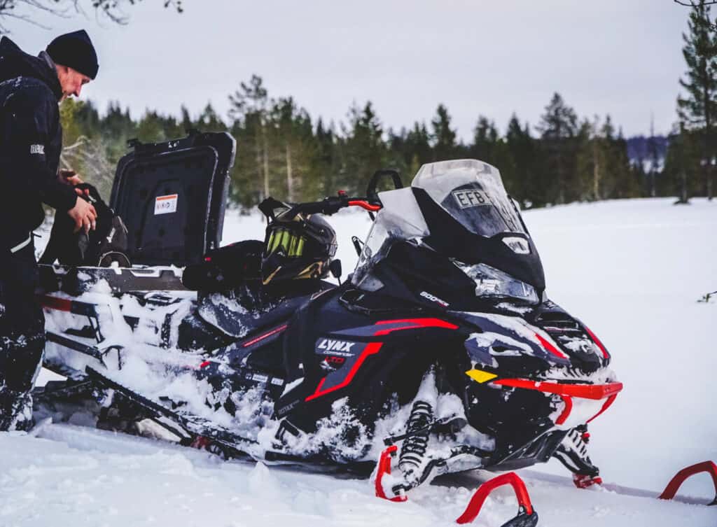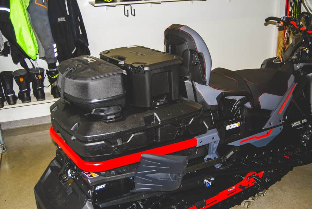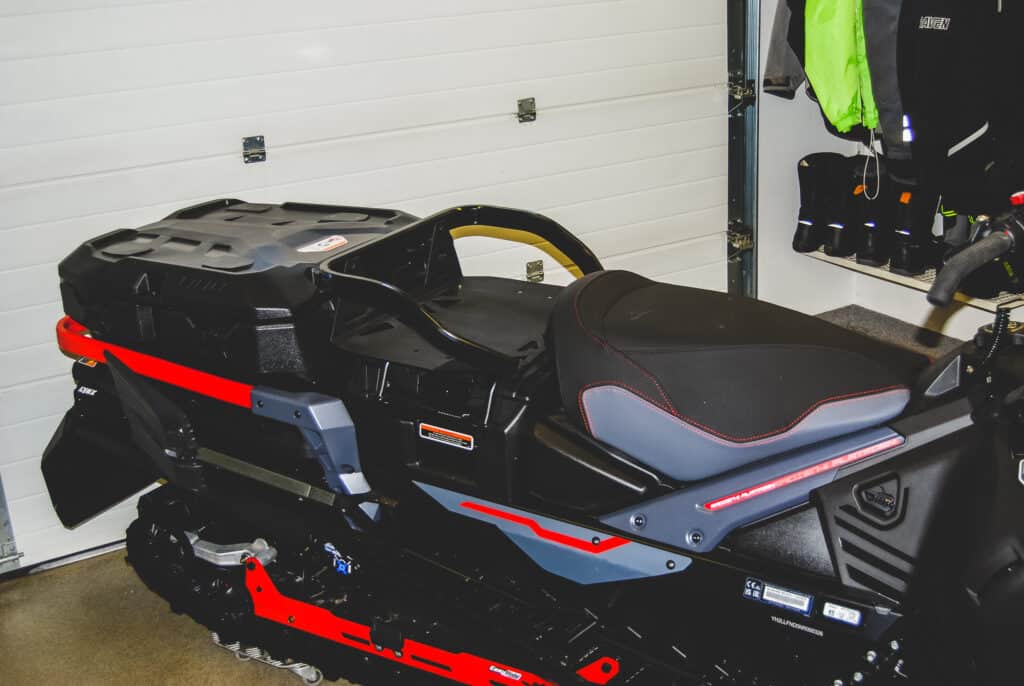 När man kommer till utrustning och tillbehör till en Lynx finns det väldigt mycket att välja på, allt från packboxar till isborrshållare, olika typer av rutor, styrväskor och mycket mer. Just denna maskin är en Limited edition och har mycket redan från leverans, men packutrymme i olika varianter får man sällan för mycket av och vi har valt till ett par Linq tunnelväskor på 18 l och 25 l som man smidigt kan montera av eller på beroende på hur mycket lastutrymme man behöver. Vi har även valt ett Linq bakre lasträcke som ersätter passagerarsätet för extra lastkapacitet när bränsledunk eller motorsåg ska med på färden. Det är en mycket enkel montering med ett gångjärnssystem så att det inte påverkar åtkomsten till utrymmet under lasträcket.